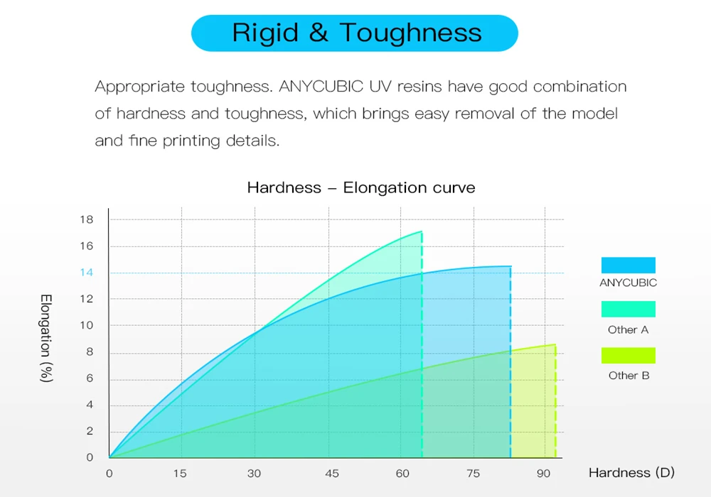Rigid & ToughnessAppropriate toughness. ANYCUBIC UV resins have good combination of hardness and toughness, which brings easy removal of the model and fine printing details.