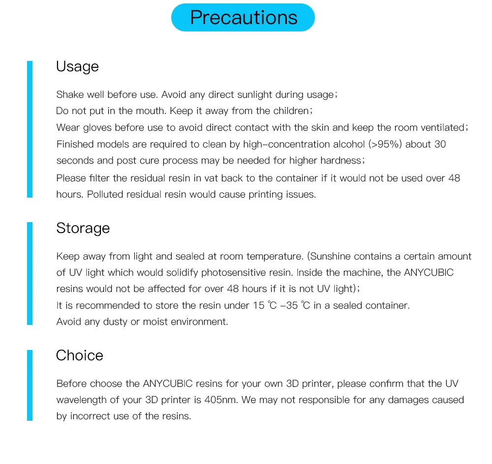 2. It is recommended to save at 15 ℃ -35 ℃ ambient temperature, the lower the temperature, the higher the viscosity of the resin. Sealed storage, excessive dust or moisture can affect print quality. Sunshine contains a lot of UV light, will solidify photosensitive resin.Usage: