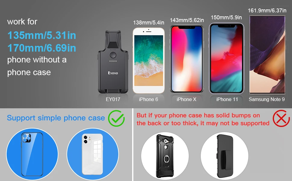 This barcode scanner is the best partner to work with phone, it is designed to clip in the back of your phone, by simple Bluetooth connection operation, when you scan barcode, you can check barcode data or quantity upload on the phone simultaneously, easy to use.