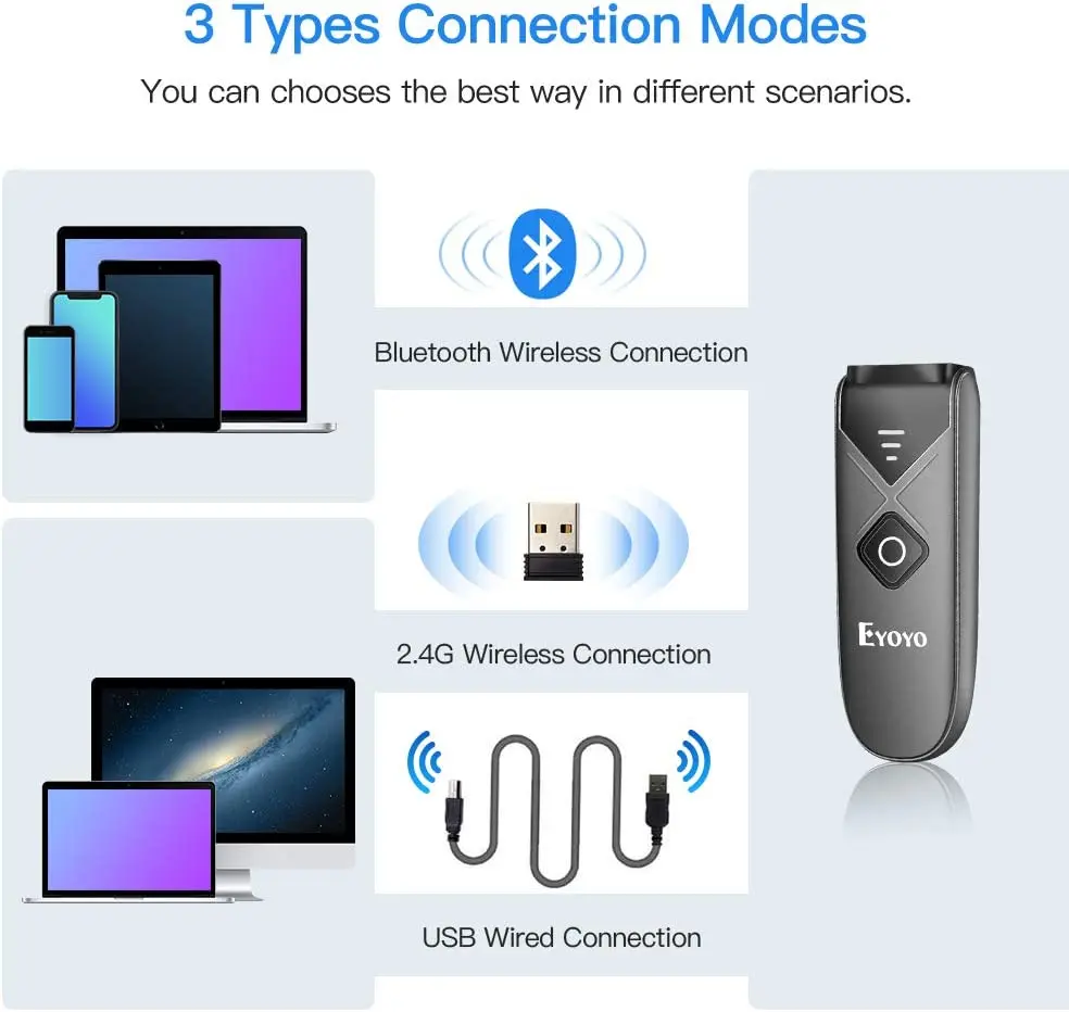 • Eyoyo EY-015 Mini Barcode Scanner USB Wired/Bluetooth/ 2.4G Wireless 1D 2D Scanner QR PDF417 EAN13 Data Matrix Bar code Reader