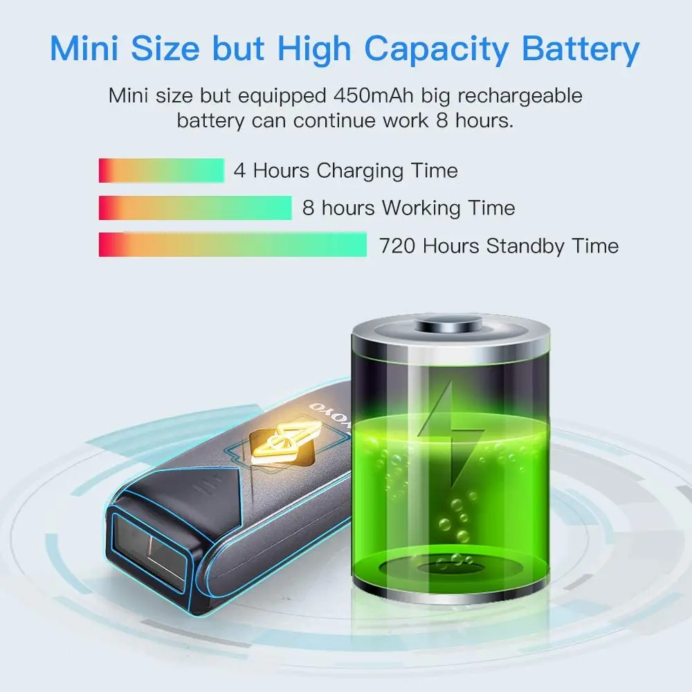 4. 450mAh rechargeable high capacity battery can use up to 8H continuous scanning time, only need 4H to charge. Standby time is up to 720Hours.