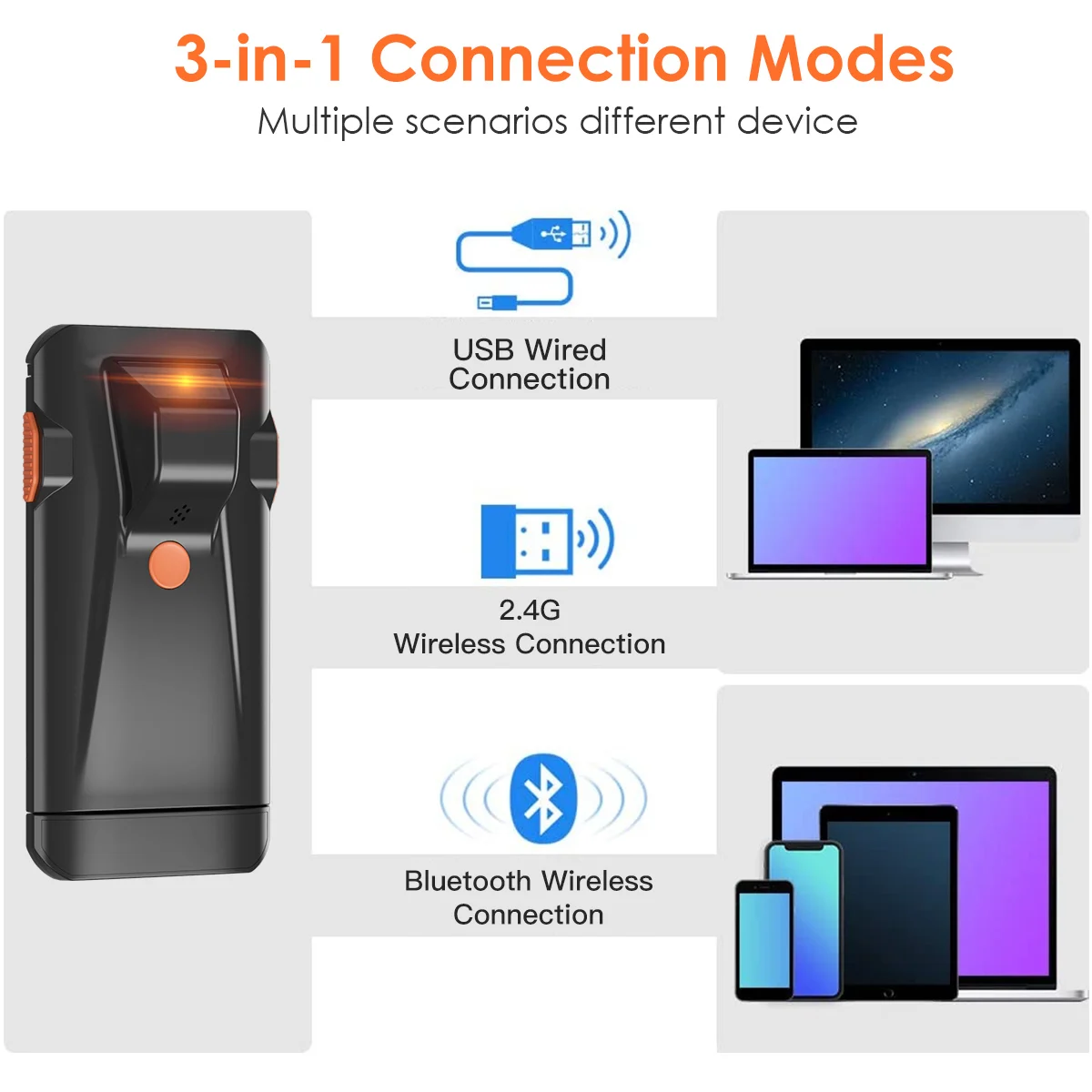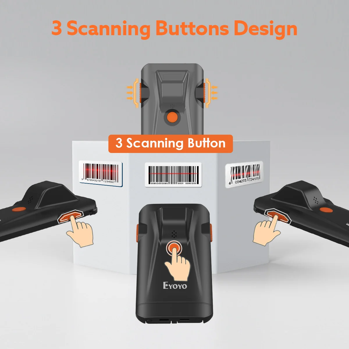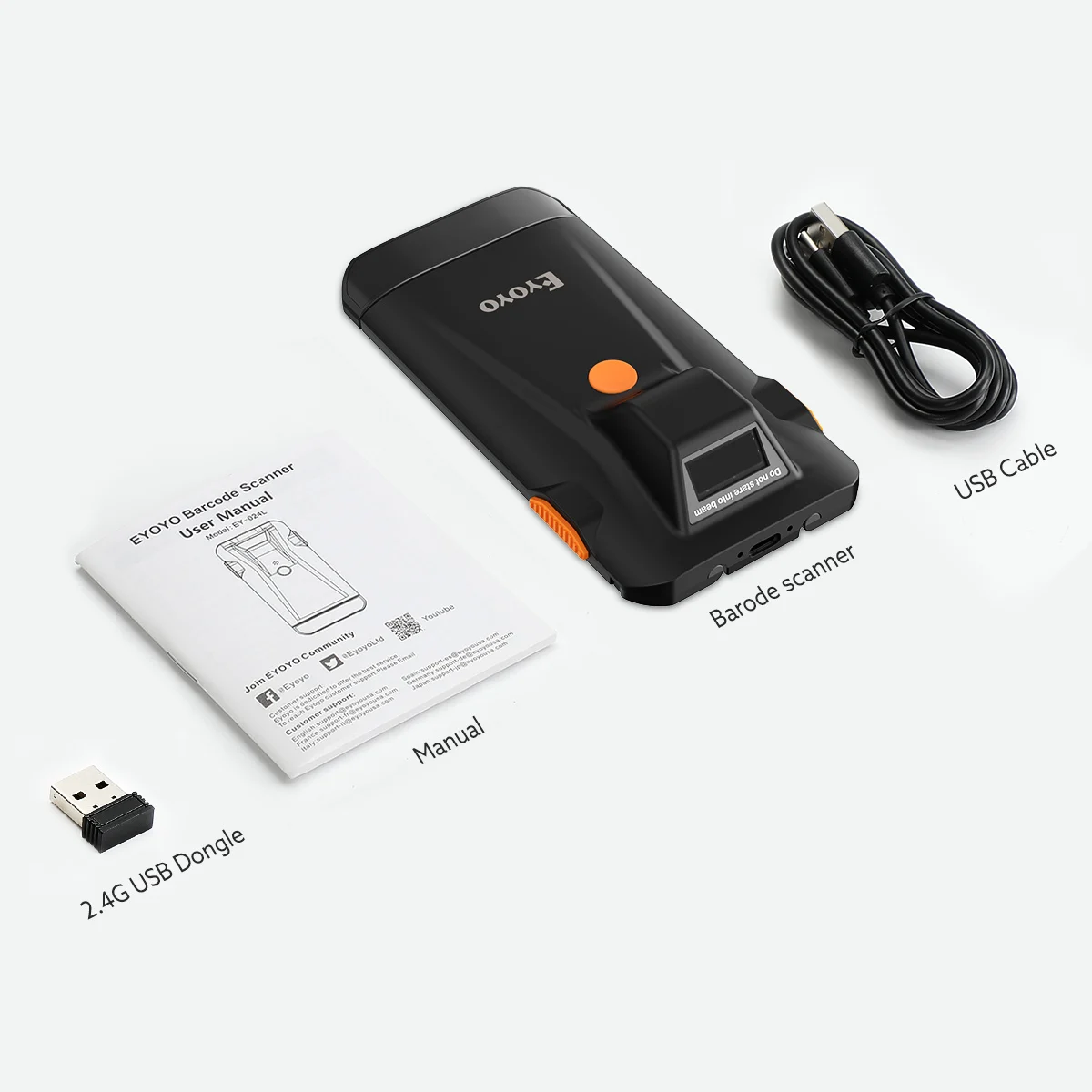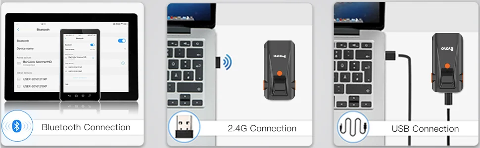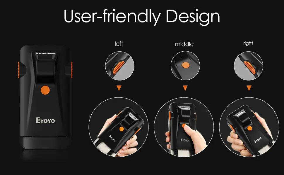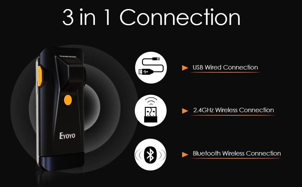 Eyoyo 1D super mini portable barcode scanner with  Bluetooth, 2.4G wireless and USB wired 3 connection ways, lightweight, easy to use and carry. Built-in 500mAh rechargeable lithium battery, supports continuous scanning most of 1D barcodes for 10 hours. Moreover, various custom configurations can be made according to your needs.
