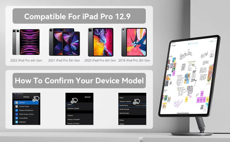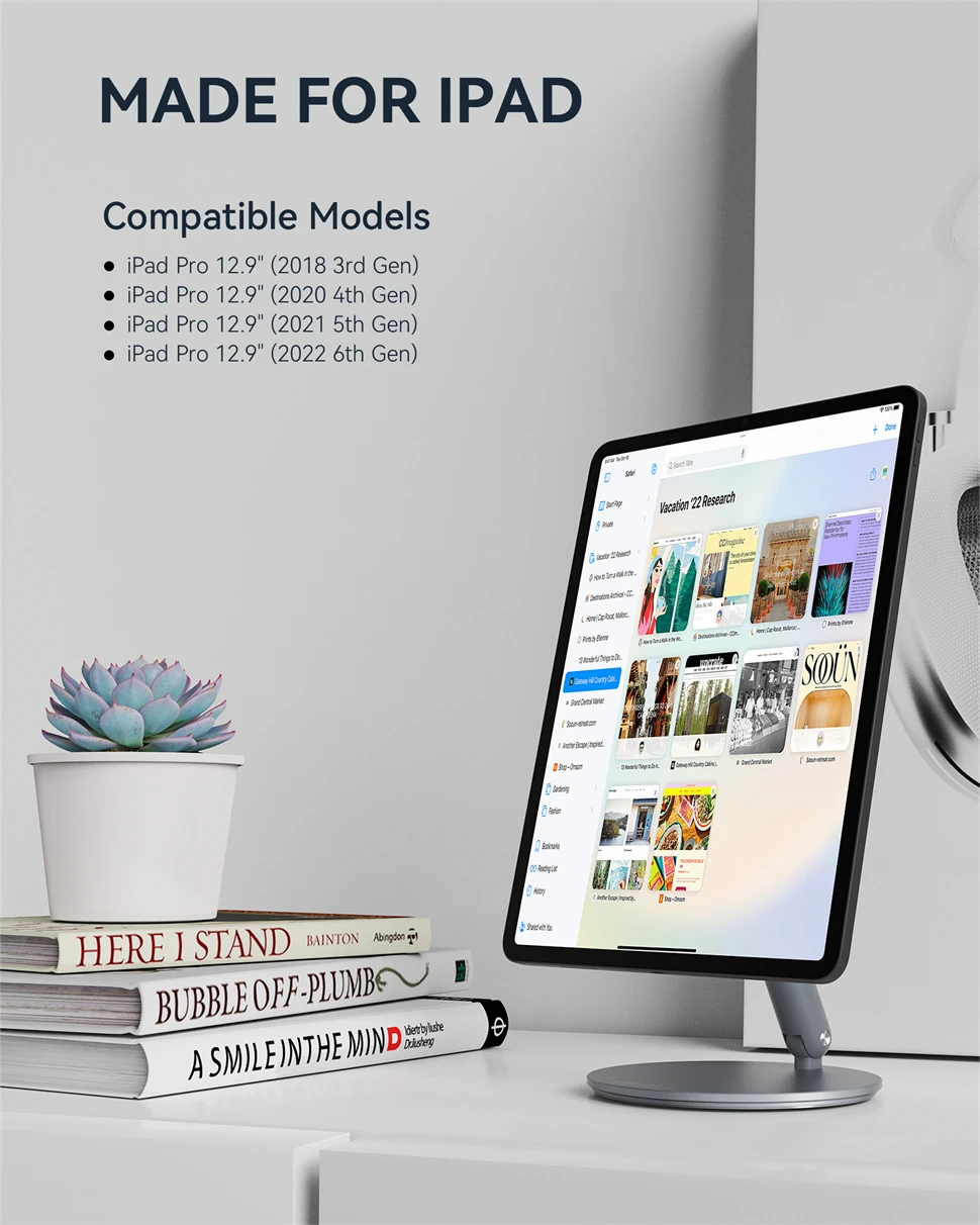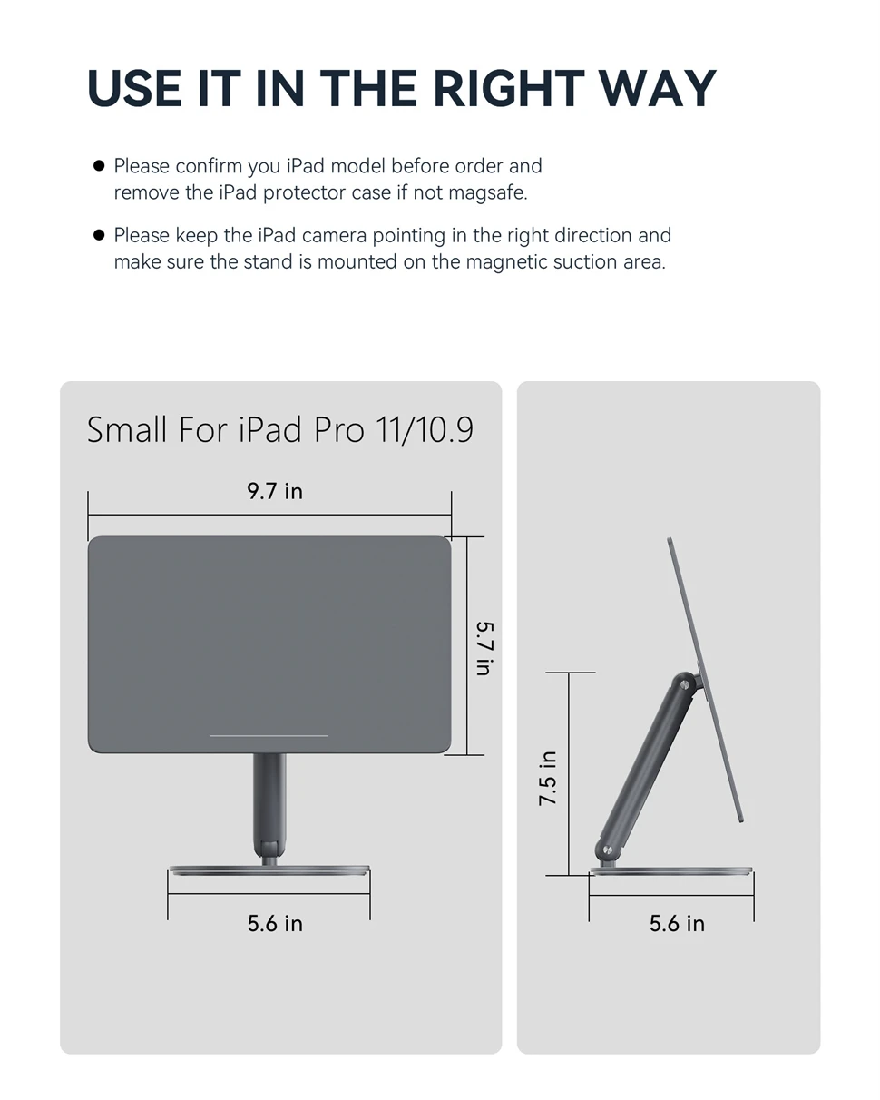 For iPad Pro 11: Fit for iPad Pro 11'' 1st/2nd/3rd/4th GenerationFor iPad Air:Fit for iPad Air 5th/4th GenerationMagnetic Floating Design: Magnetic Floating design brings you a best experience With iPad. Secure magnetic holder, It's easy to place your device on the holder, use our magnetic stand and universal controls add a 2nd monitor in a snap make your tablet look like a mini Mac.Compatible with Apple Pencil 2 wireless charging (Pencil Not Included).Magic Magnet Experience: the stand for iPad Pro with strong built-in magnet which automatically aligns and holds with iPad Pro/iPad Air 4th/iPad Air 5th in place, showing the screen to you with ergonomic viewing experience.Foldable Portable Adjustability Stand: Foldable Portable 360° rotating Base design, great ideal for taking Zoom calls, video watching, taking notes, drawing on iPad or cooking in the Kitchen. 360°swivel rotation floating Multi-Angledesign offers portrait and landscape viewing. Adjustable, Sturdy hinge can be easily tilted for multiple viewing angles to meet your needs. Enjoy hands-free, comfortable viewing on the iPad screen.Robust Aluminum Stand and Anti-Slip Silicone Pads: the holder made of extremely hard and durable aluminum material, the anti-slip and scratch silicone pad provides comprehensive care for your iPad. The magnetic stand holder for iPad Pro has a beautiful, sleek, minimalist surface to go with your exquisite desktop atmosphere.