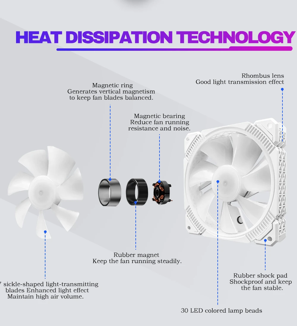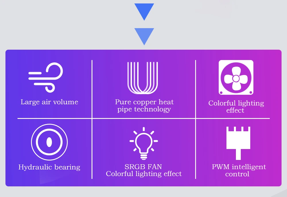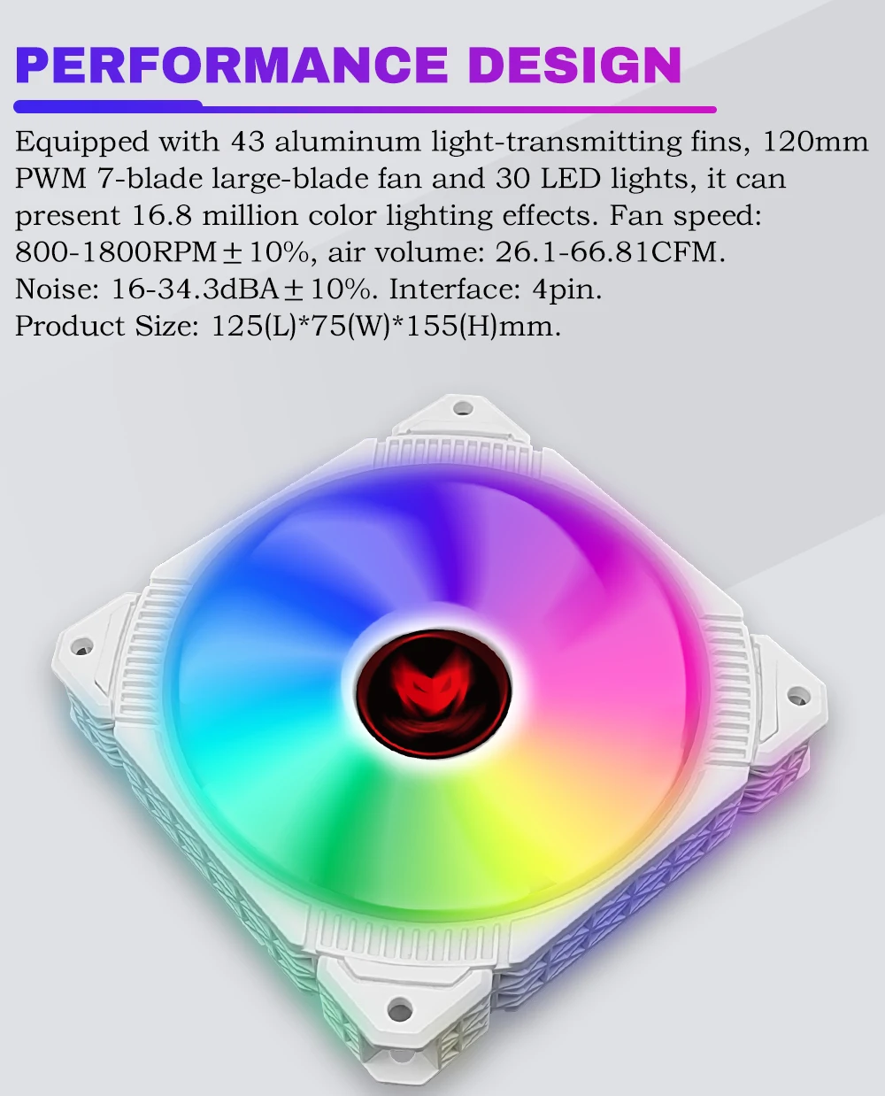 2. Excellent performance: equipped with 42 light-transmitting aluminum fins, 120mm PWM 9-blade fan and 16.8 million color cold light effects. Fan speed: 800-1800RPM±10%, air volume: 26.1-66.81CFM. Noise: 20.55-37.2dBA±10%. Interface: 4pin.