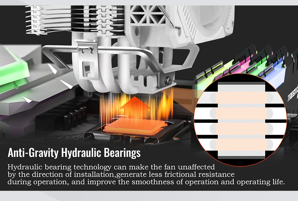 1. Efficient heat dissipation: CPU air cooling adopts 4 6*6mm U-shaped AGHP pure copper nickel-plated heat pipes, and the bottom is mirror HDT polished, which can be seamlessly fitted with the CPU to achieve rapid heat conduction.
