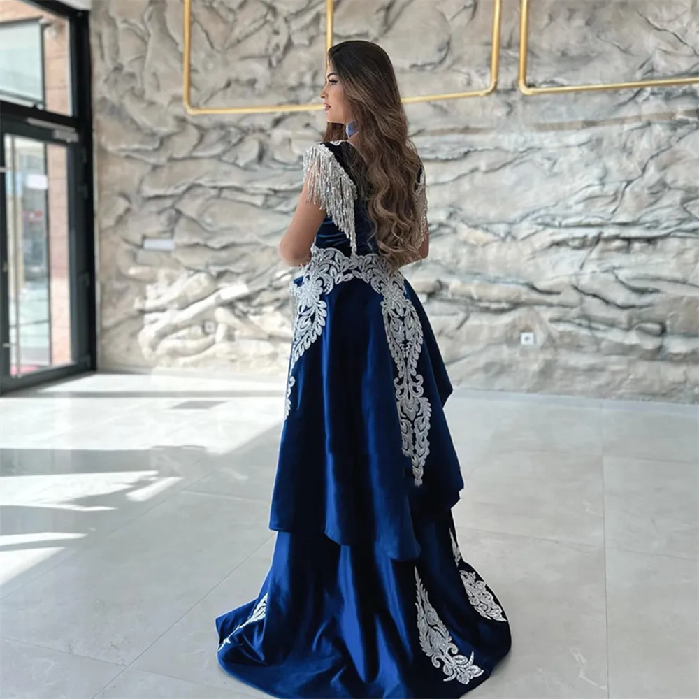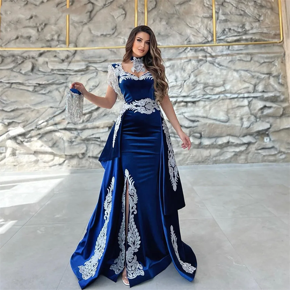 Moroccan Caftan Evening Dress Appliques Lace Cap Sleeve Royal Blue Mermaid Slit Arabic Prom Gowns Party Dress 2022