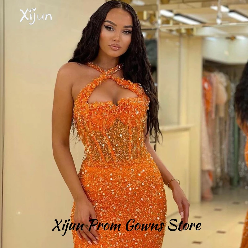 Xijun Arabic Sequin Mermaid Evening Gowns Sexy Halter Beaded Formal Party Dresses Saudi Arabia Sleeveless Long Prom Gown Women
