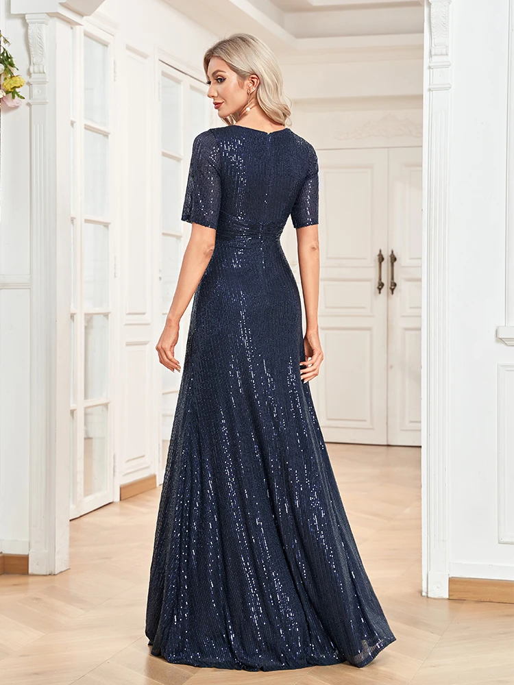 XUIBOL Short Sleeves Floor Length V-Neck Evening Dress 2022 Women Party Maxi Dress Sequin Beading Long Prom Blue Cocktail Dress