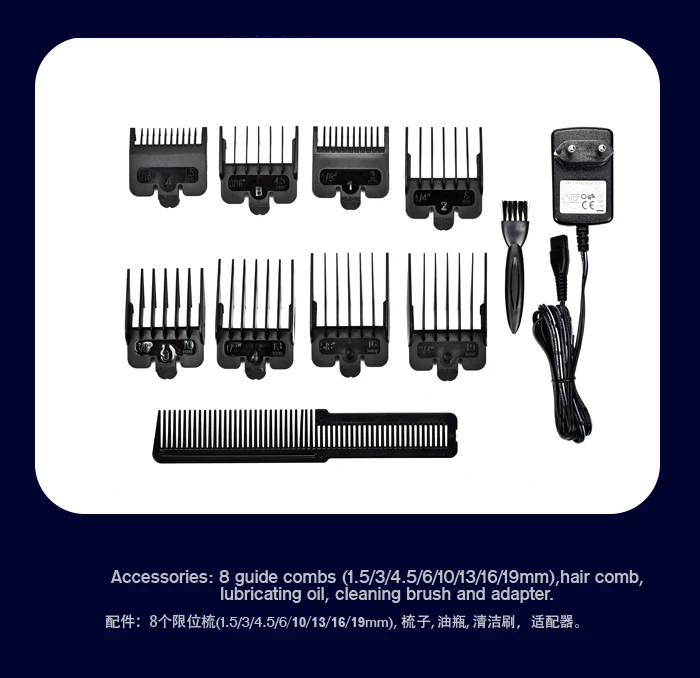 (1.5/3/4.5/6/9/12/16/19mm) hair comb, cleaning brush and adapter.