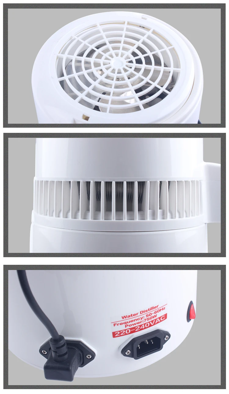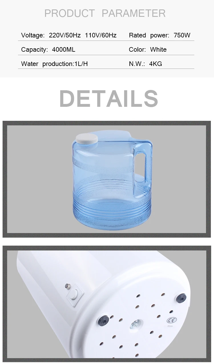 DetailSpecification:Voltage: 220V-240V / 110VFrequency: 50Hz/ 60HzRated power: 750WCapacity: 4000MLColor: WhiteWater production:1L/HN.W.: 4KG