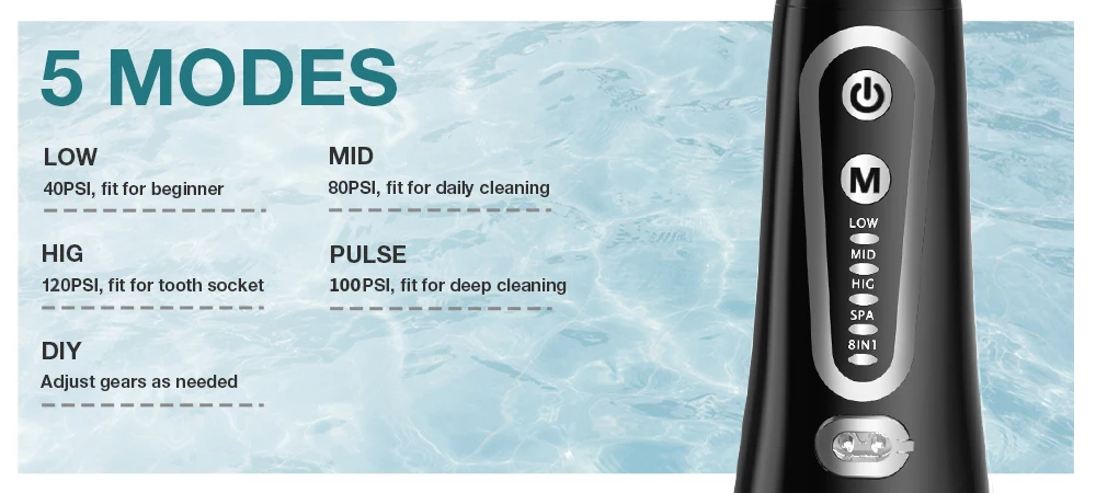 Adopt Water Flosser Pulse Technique, 360°Rotating Nozzle, Low, Medium, High, Pulse, Diy, 5 Cleaning Modes can Clean Every Corner of the Mouth Stains, Plaque, But also Helps Massage The Gums and Protect Teeth Sensitivity, It is Suitable for People with Braces, Implants, Periodontitis and Bleeding Gums