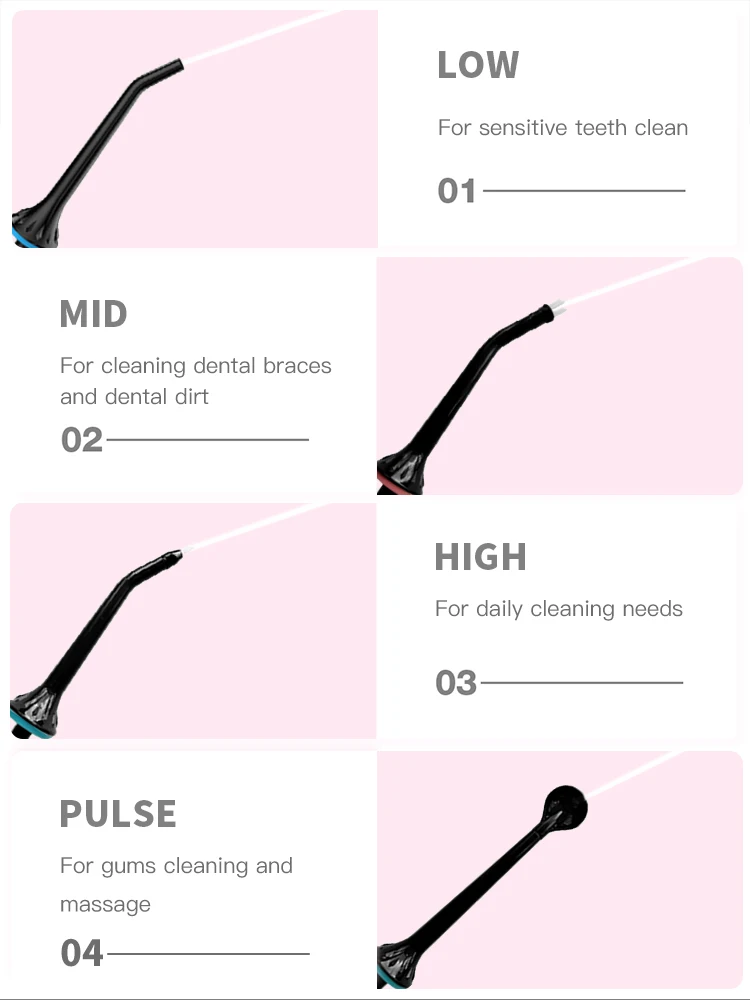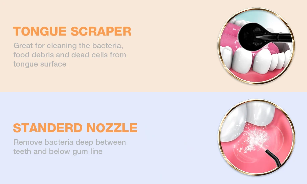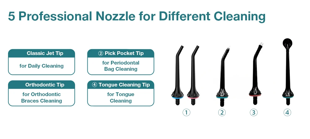 Water flosser can clean any corner of the oral:gaps、inner teeth、gum grooves 、tongue or braces cleaning; nozzles can be free replacement or use with family.