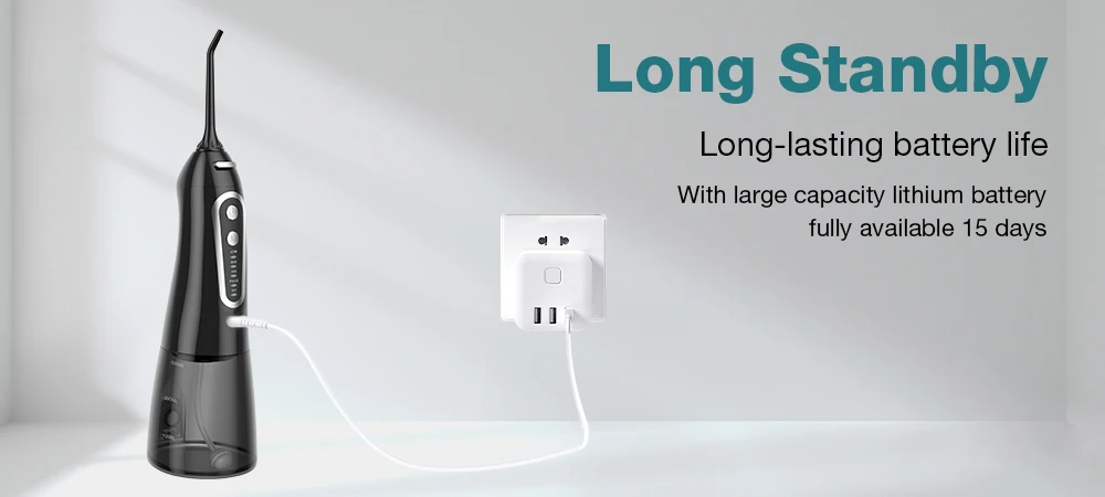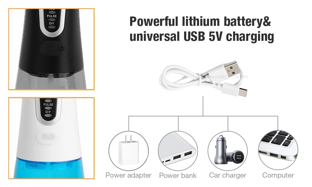 Portable oral irrigator is good for traveling, or use at home,office, hotel. USB cordless water pick convenient for charging anywhere at anytime.