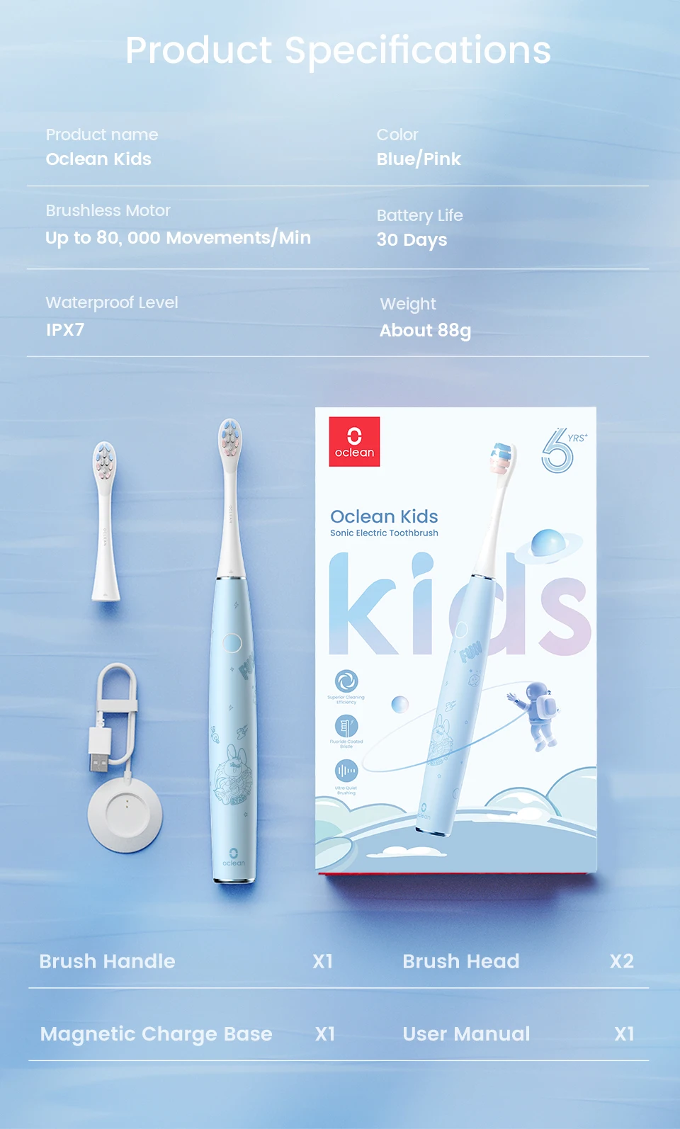 Product SpecificationsProduct name: Oclean KidsColor: Blue/PinkBrushless Motor: Up to 80,000 Movements/minBattery Life:30 DaysWaterproof Level: IPX7Weight: About 88gBrush Handle*1 Brush Head*2Magnetic Charge Base*1 User Manual*1
