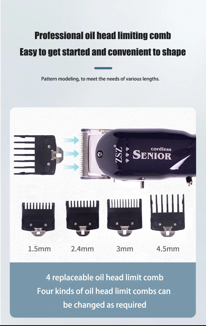 Four kinds of oil head limit combs can be changed as required.