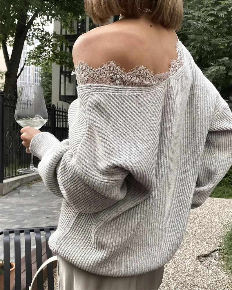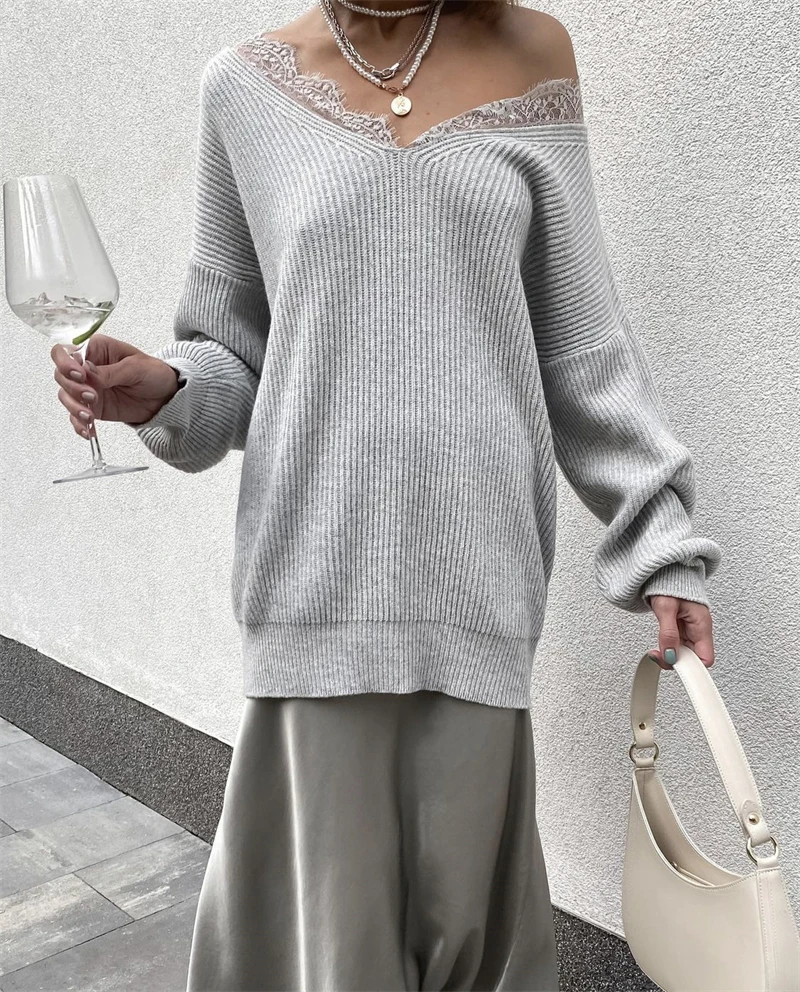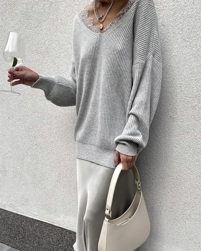 Soft Loose Knitted Sweater Women Autumn Winter New Lace V-neck Basic Pullovers Female Casual Solid High Street Jumper