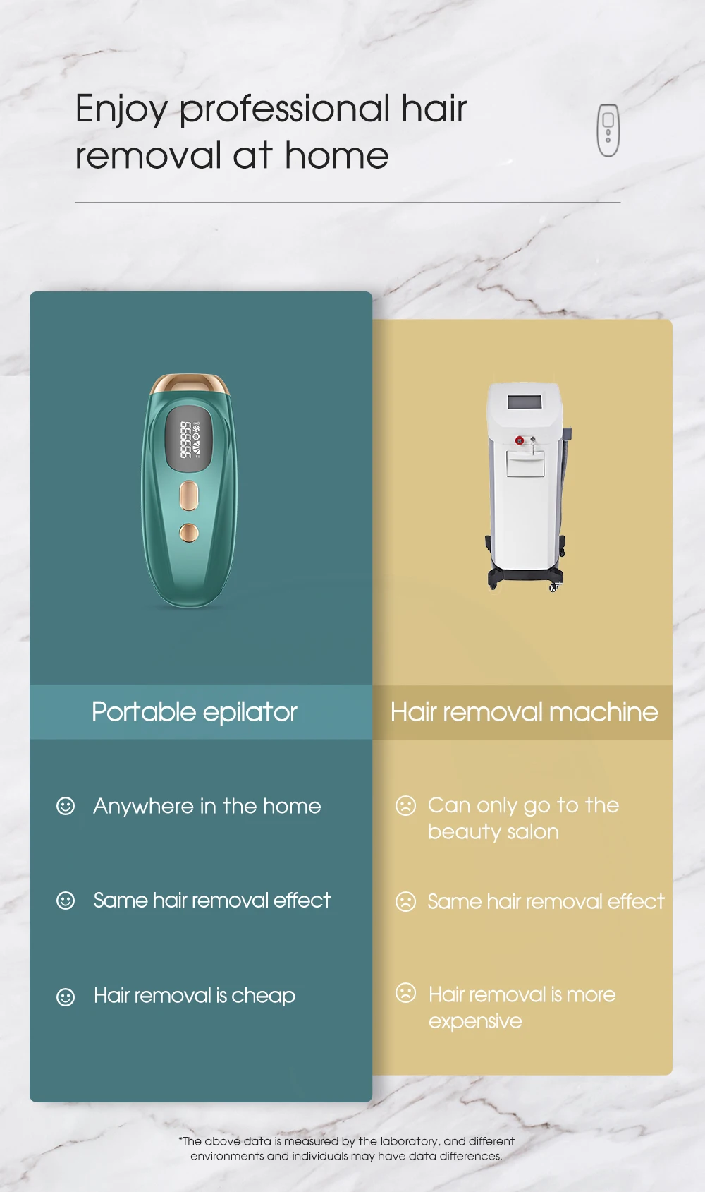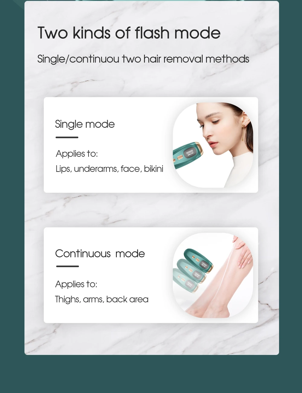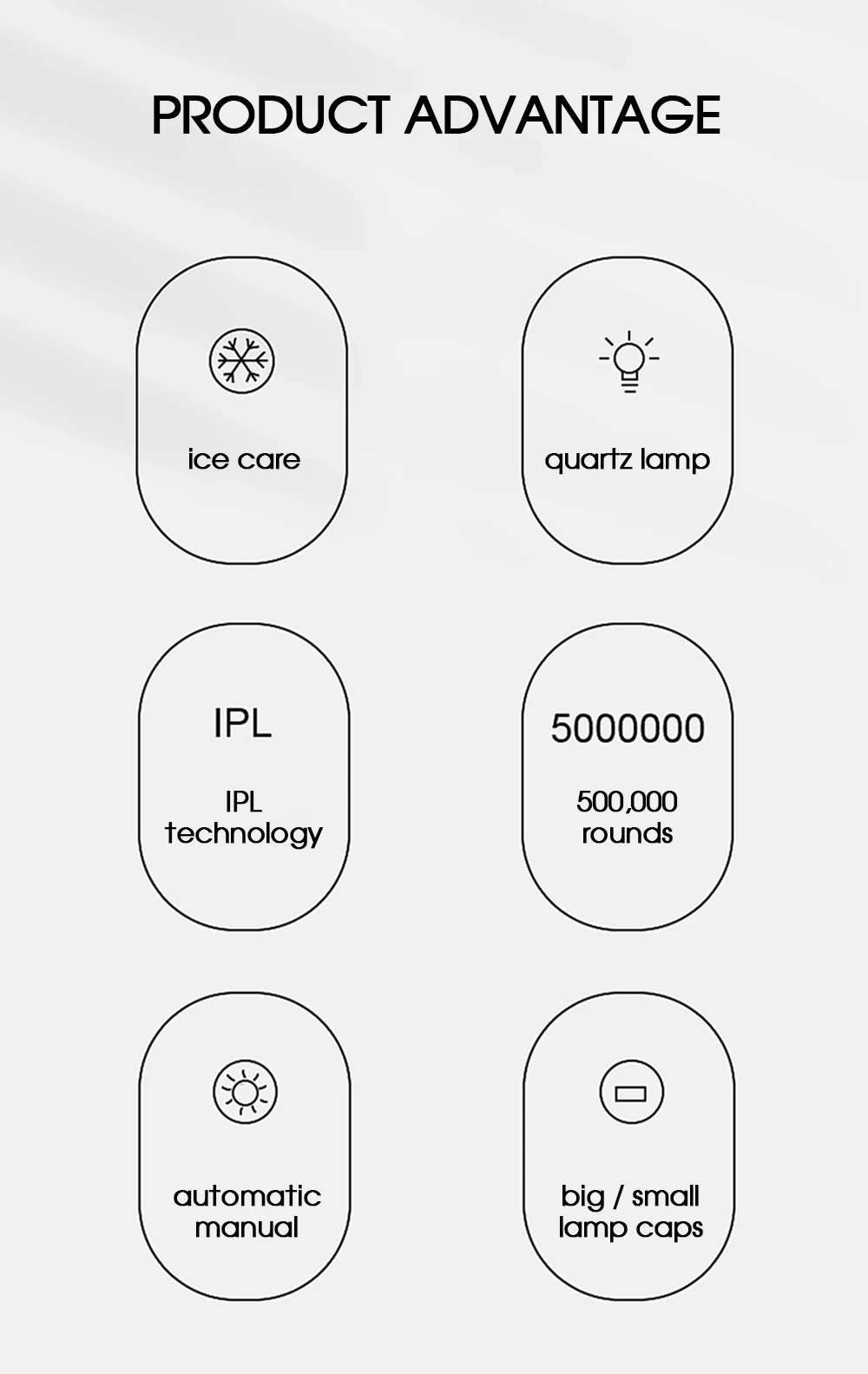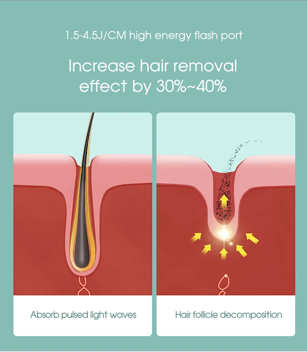 ● Troubles encountered in hair removal. The matching operation effect is better. 1, scraper. 2, hair removal cream. 3, honey wax.● Enjoy the hair removal effect of the beauty salon.● Portable Epilator and hair removal machine effect comparison.Anywhere in the home, same hair removal effect, hair removal is cheap.● Shed thick hairs from the roots. Let every inch of skin have it's own energy focus.● 1.5-4.5J/cm high energy flash port. increase hair removal effect by 30%-40%. Absorb pulsed light waves. Hair follicle decomposition.● Refuse to repeat, hair removal from the roots.● Through the comparison of the effects of the portable epilator before and after use.● Two kinds of flash mode. single mode, applies to lips, underarms, face, bikini. Continuous mode, applies to thighs, arms, back area.● 999,999 flashes, one device solves all problems.