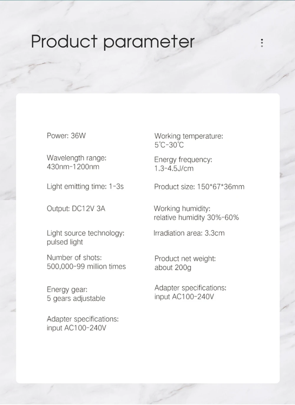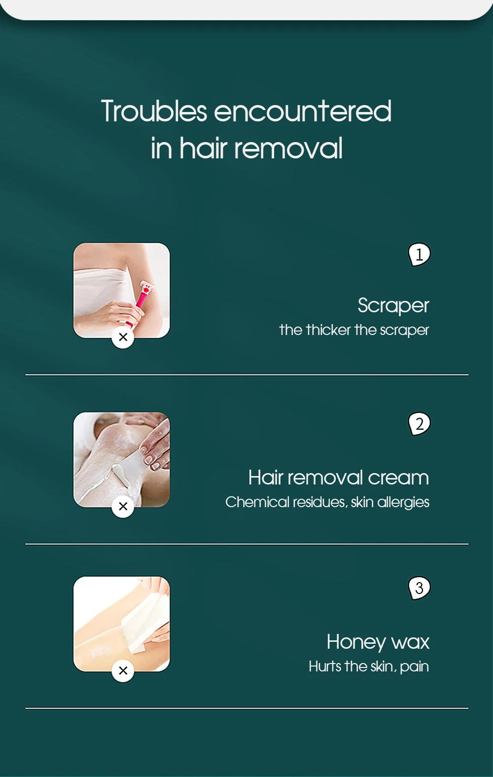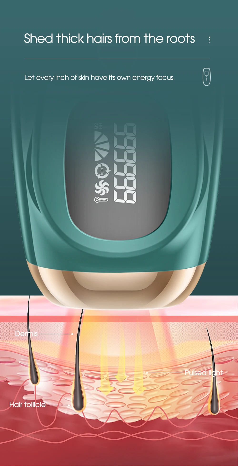 ● Troubles encountered in hair removal. The matching operation effect is better. 1, scraper. 2, hair removal cream. 3, honey wax.● Enjoy the hair removal effect of the beauty salon.● Portable Epilator and hair removal machine effect comparison.Anywhere in the home, same hair removal effect, hair removal is cheap.● Shed thick hairs from the roots. Let every inch of skin have it's own energy focus.● 1.5-4.5J/cm high energy flash port. increase hair removal effect by 30%-40%. Absorb pulsed light waves. Hair follicle decomposition.● Refuse to repeat, hair removal from the roots.● Through the comparison of the effects of the portable epilator before and after use.● Two kinds of flash mode. single mode, applies to lips, underarms, face, bikini. Continuous mode, applies to thighs, arms, back area.● 999,999 flashes, one device solves all problems.