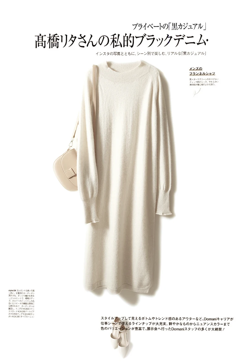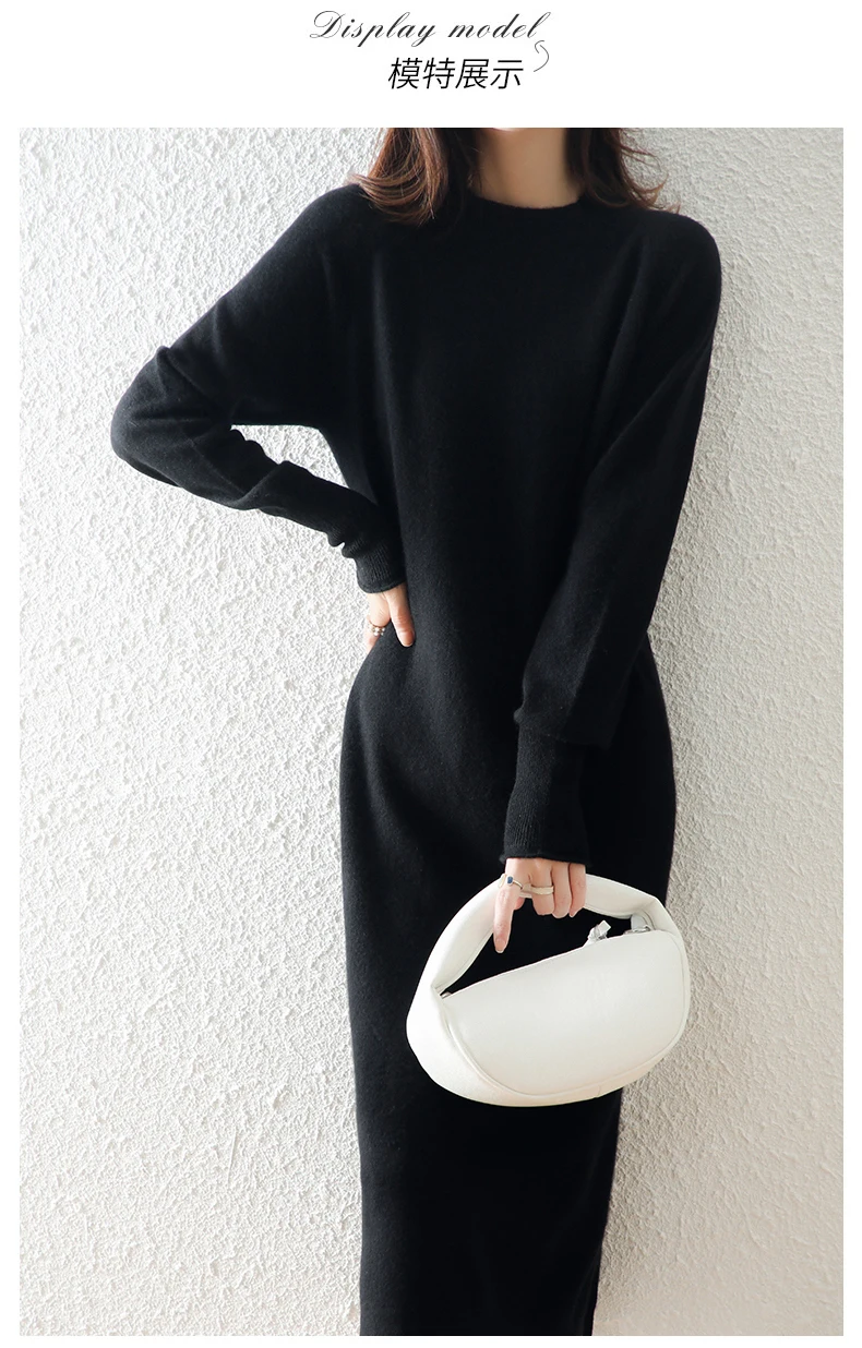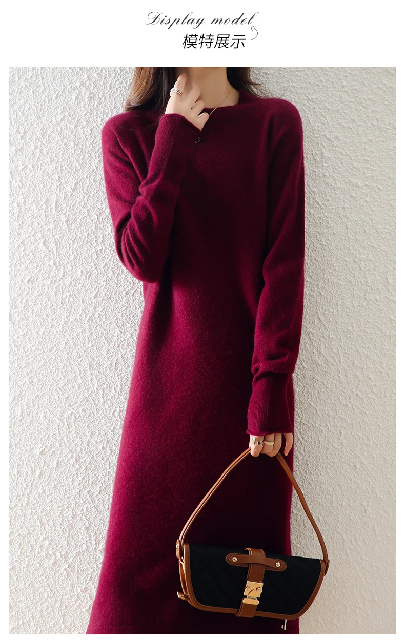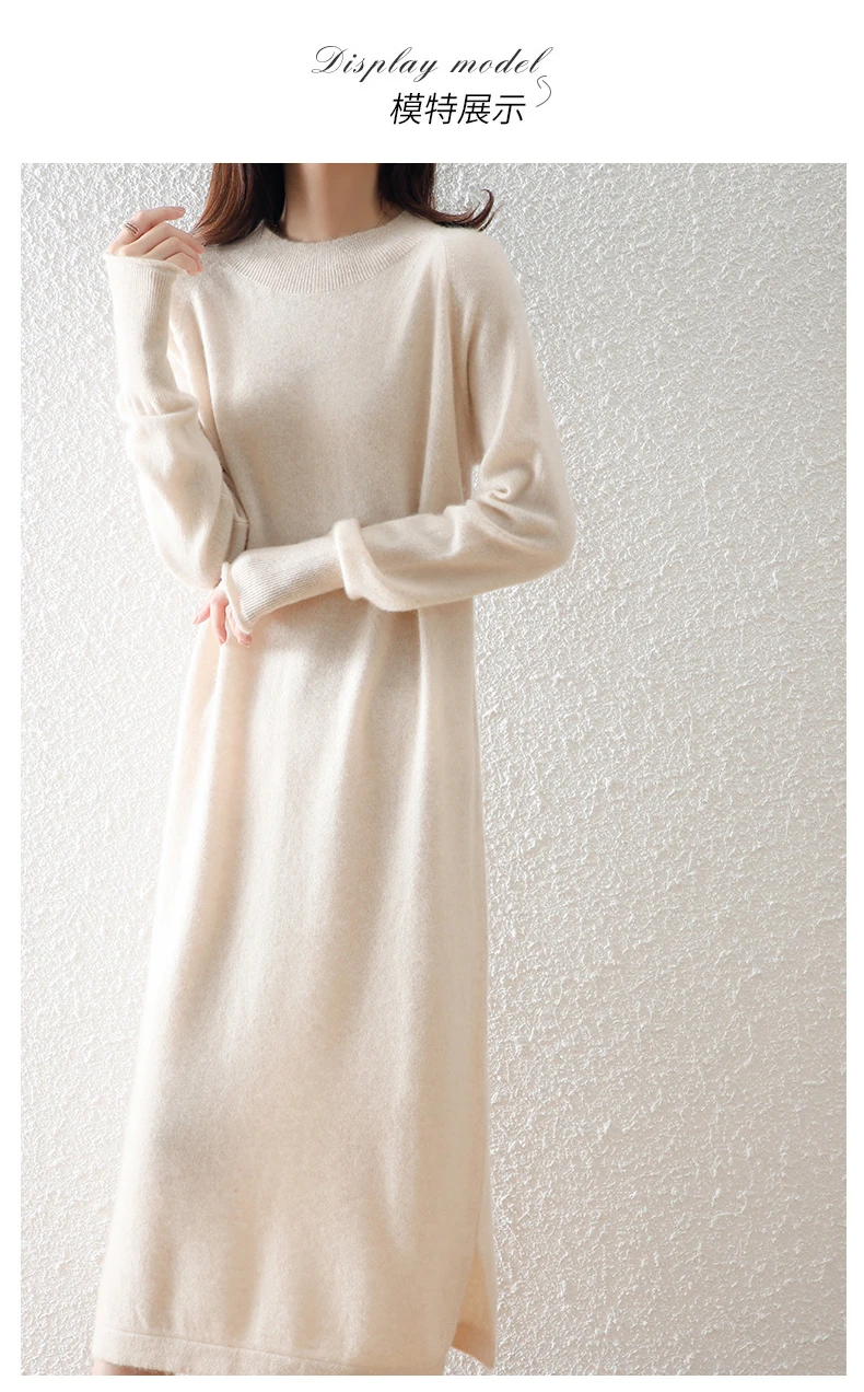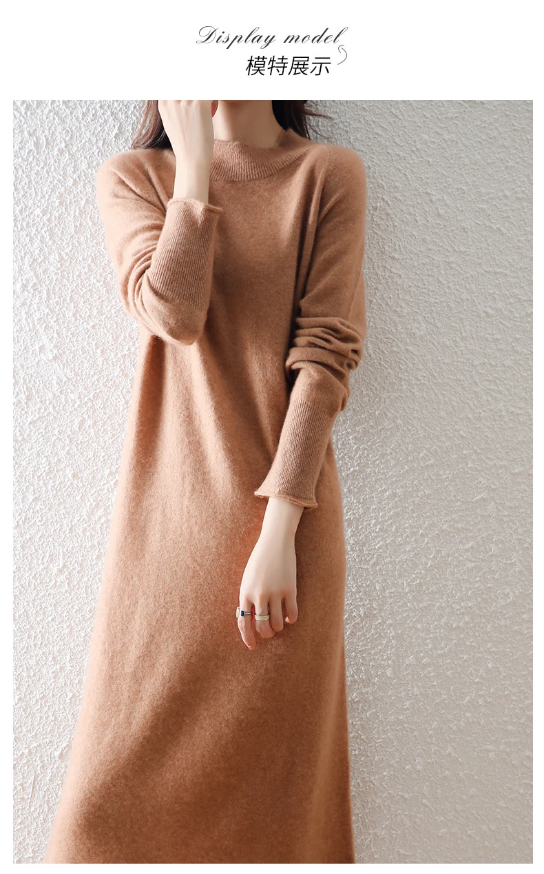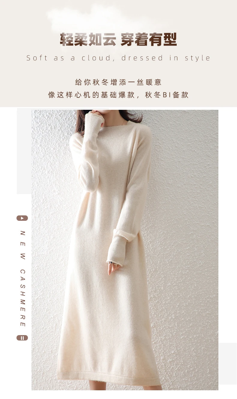 • 100% Pure Cashmere Knitted Women Dresses Elegante Dress Winter Soft Oneck Loose Jumpers Vestido Ladies Solid Long Sleeve Dress