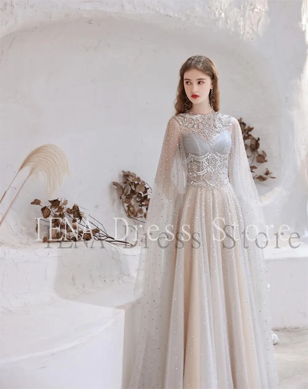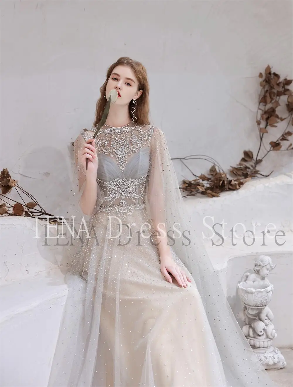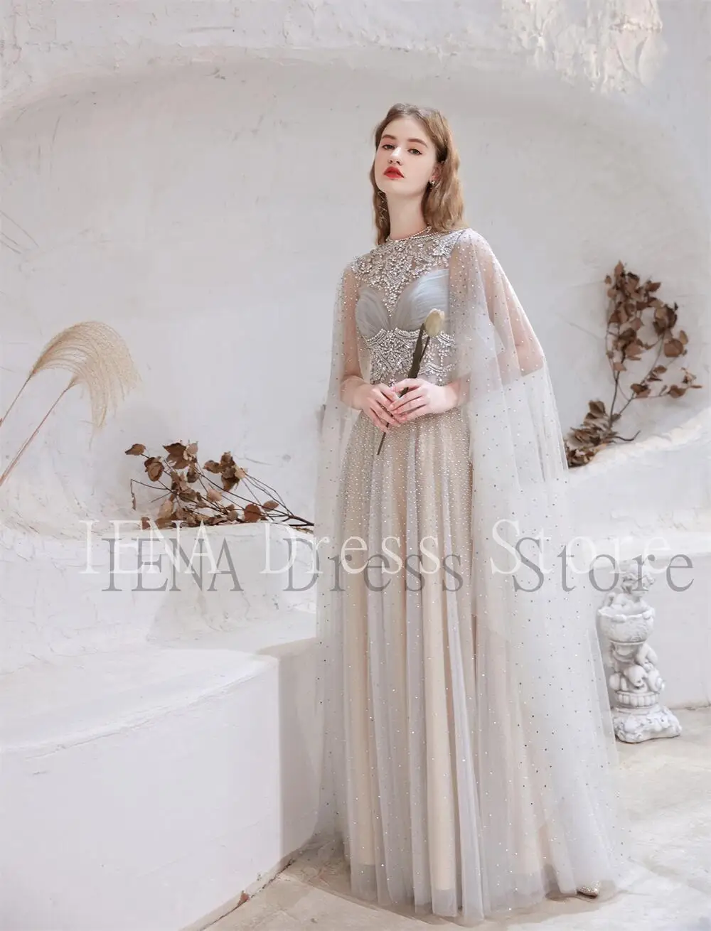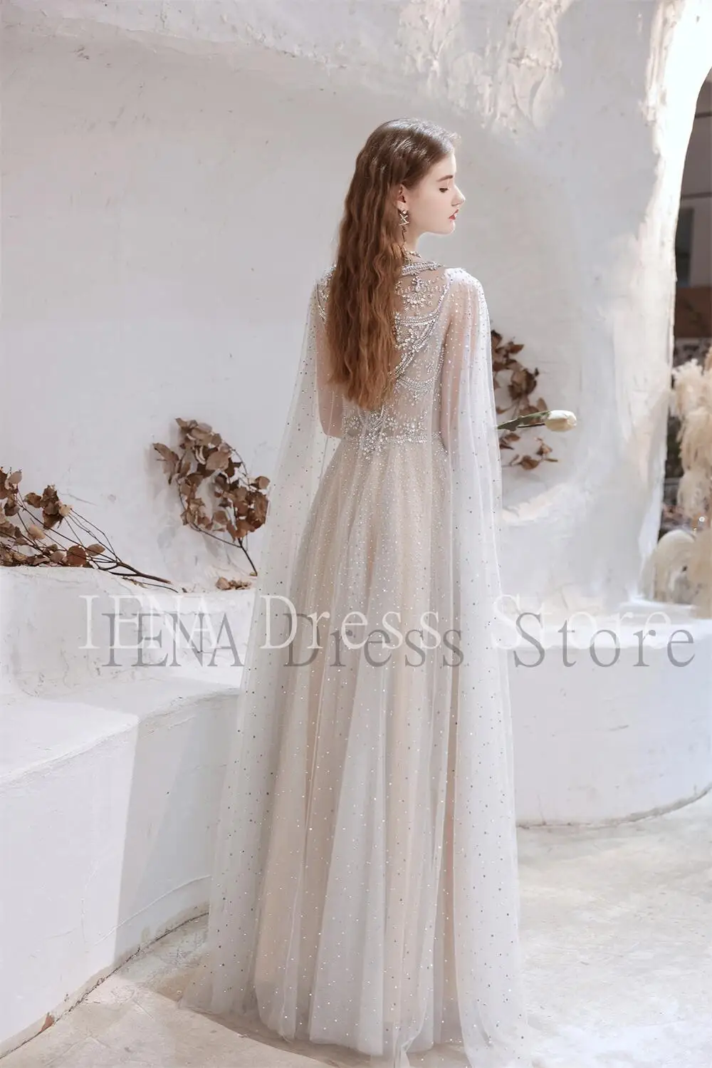 14272#IENA Long Cape Sleeves Chiffon Bohemian Prom Dresses 2023 Backless Vintage Crew Neck Party Gowns Plus Size Evening Dresses