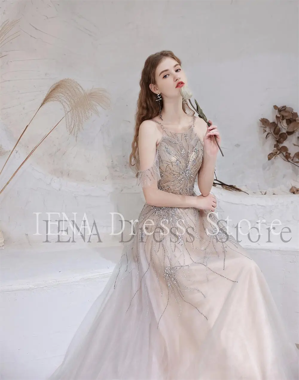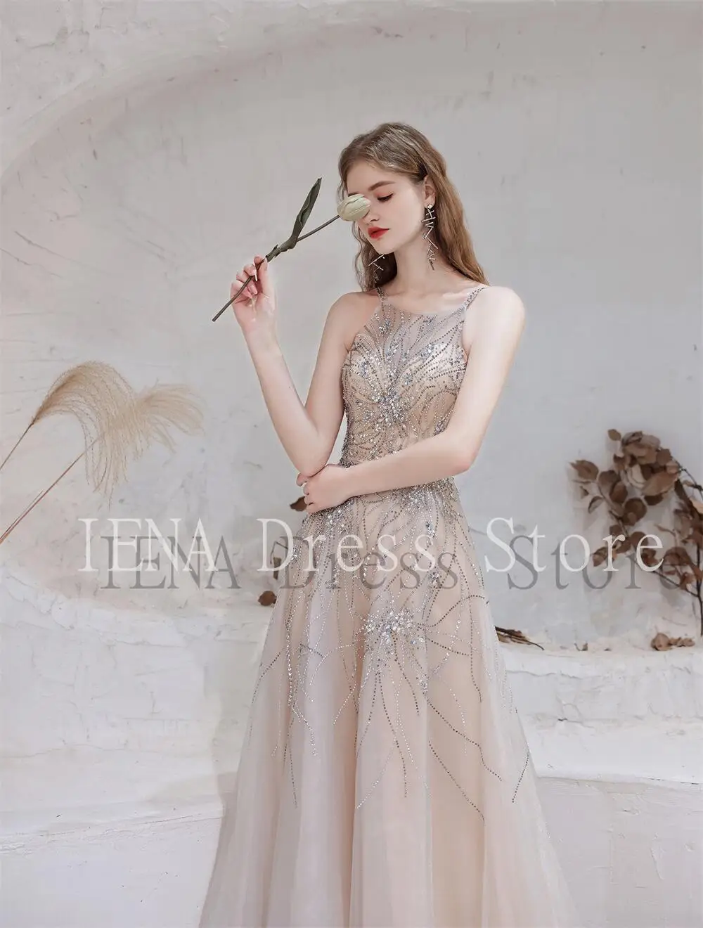• 14273#IENA Champagne Sequins A-Line Prom Dresses Elegant Halter Evening Gown 2022 Off the Shoulder Plus Size Women Formal Dress