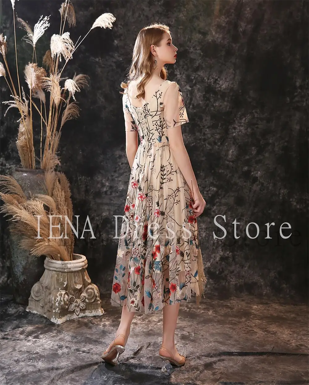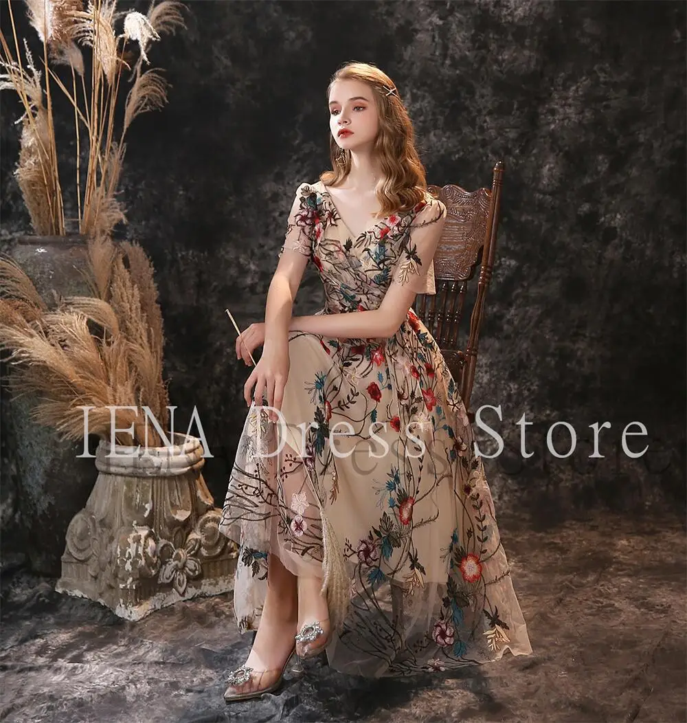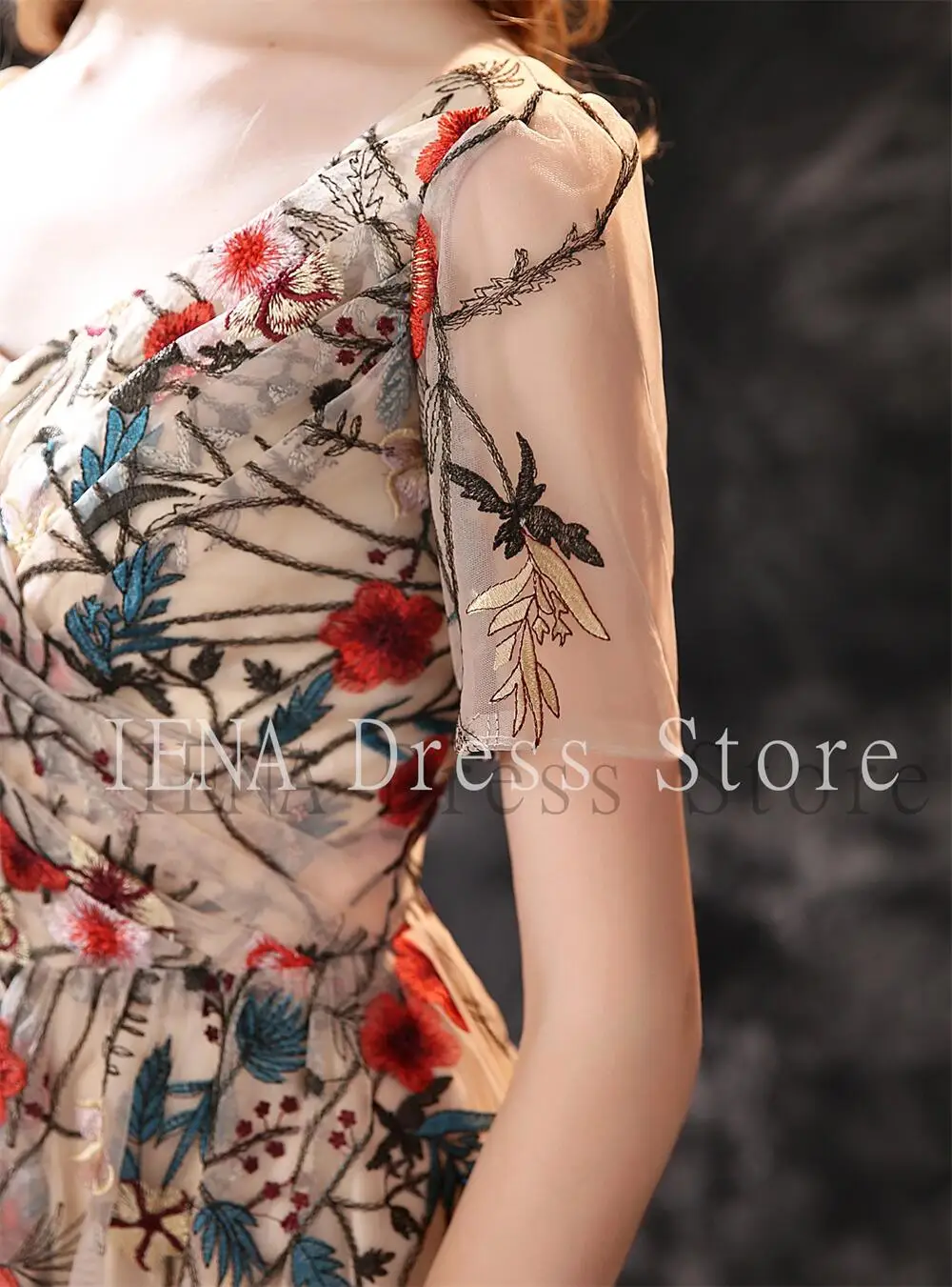 14280#Floral Prom Dresses Embroidery Romantic Colorful Flower Pattern Sheer Sleeves Evening Party Banquet Wedding Birthday Gowns