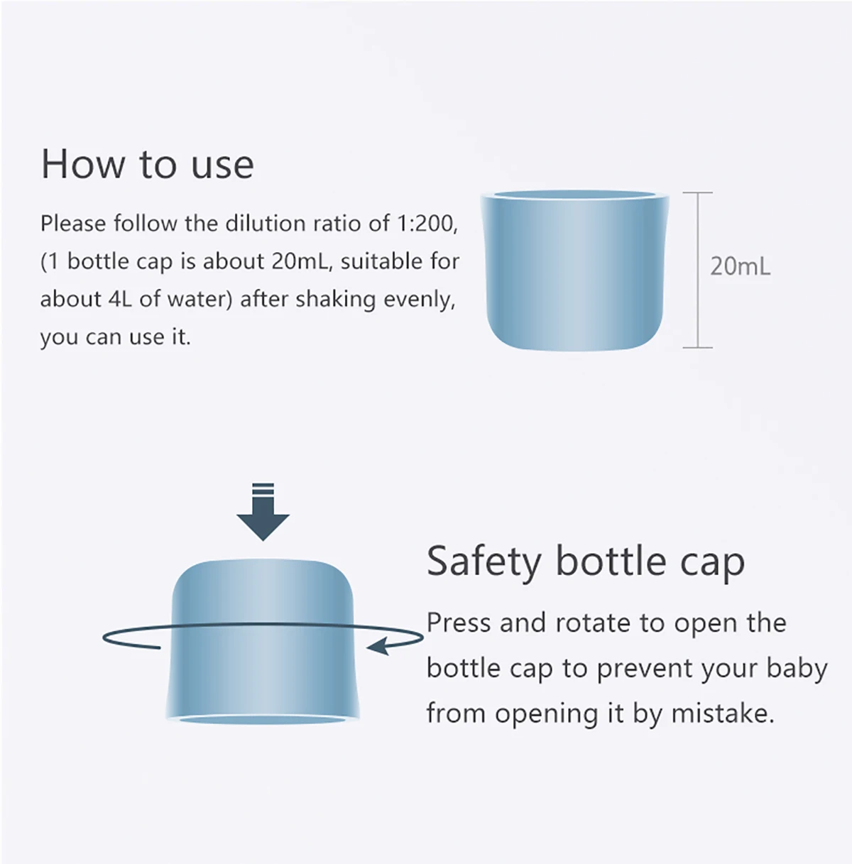 First step:Please follow the dilution ratio of 1:200, (1 bottle cap is about 20mL, suitable for about 4L of water) after shaking evenly, you can use it.