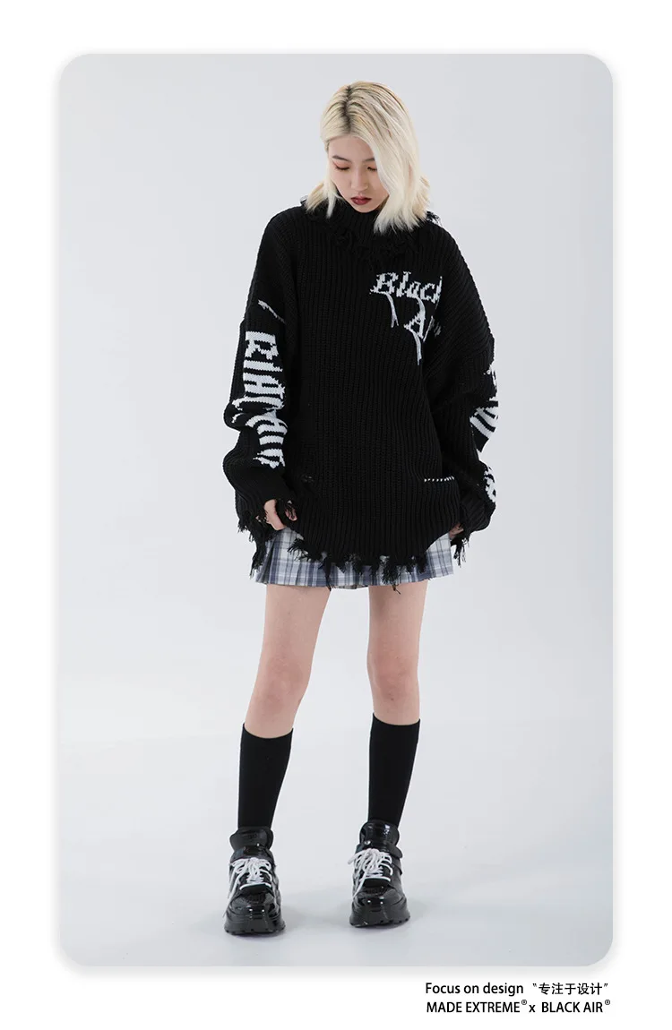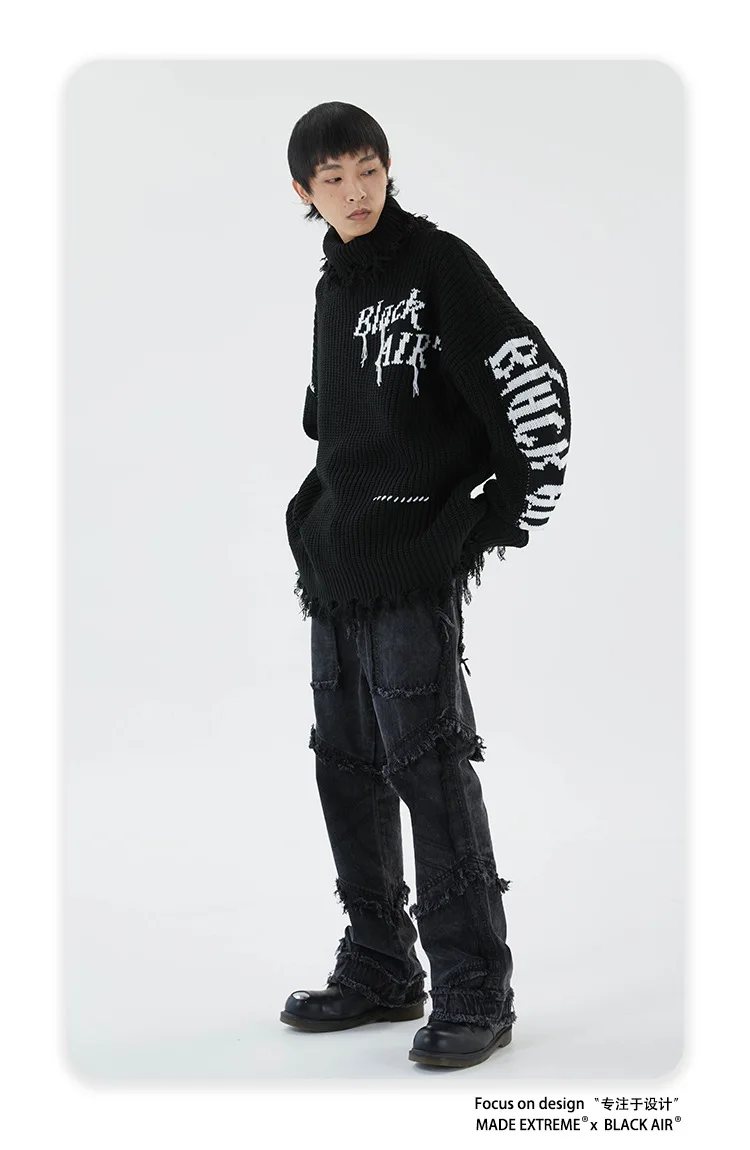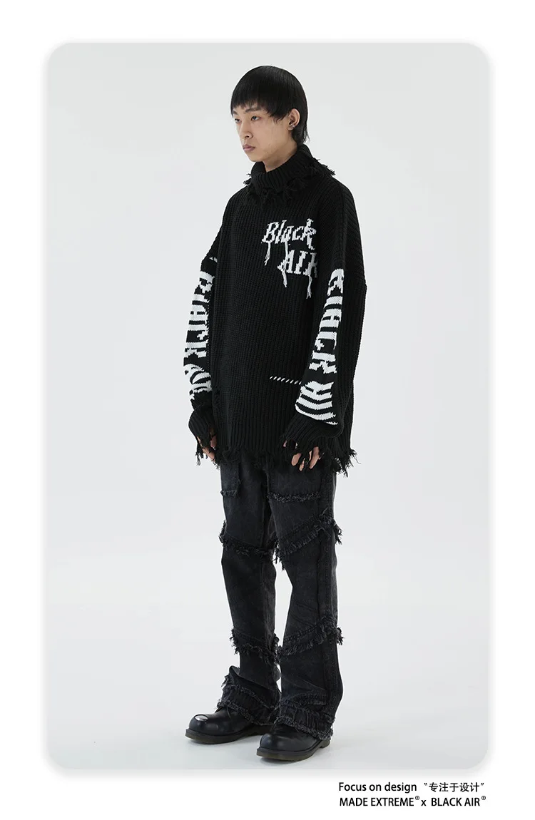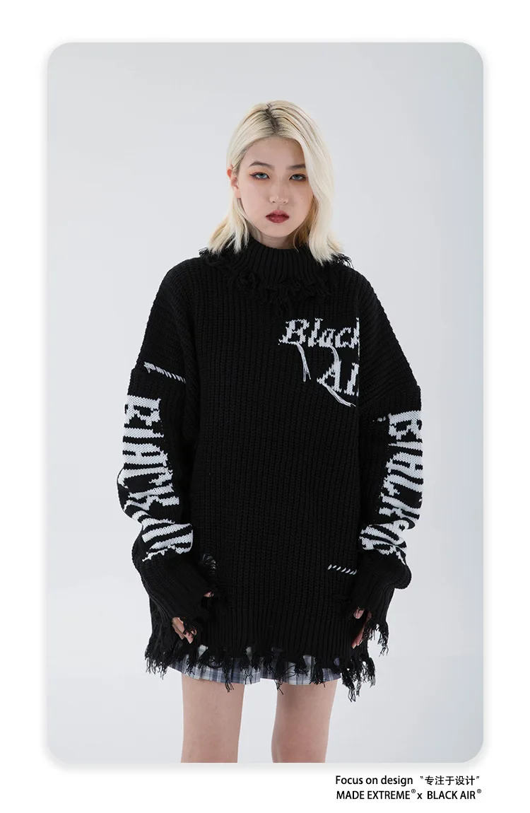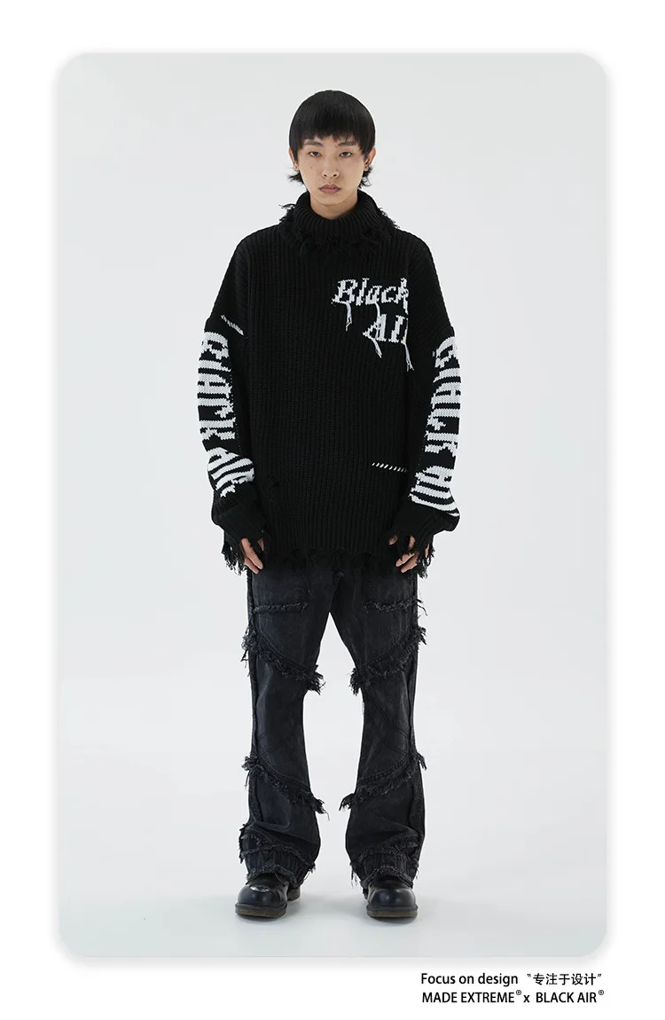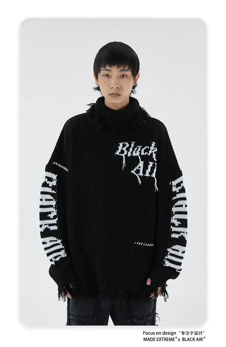 2021 Ripped Hole Punk Turtleneck Sweater Mens Harajuku Vintage Pullover Women Embroidery Hip Hop Goth Knitted Sweater Jerseys