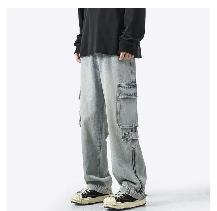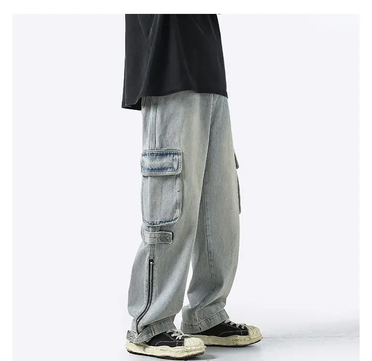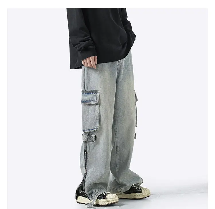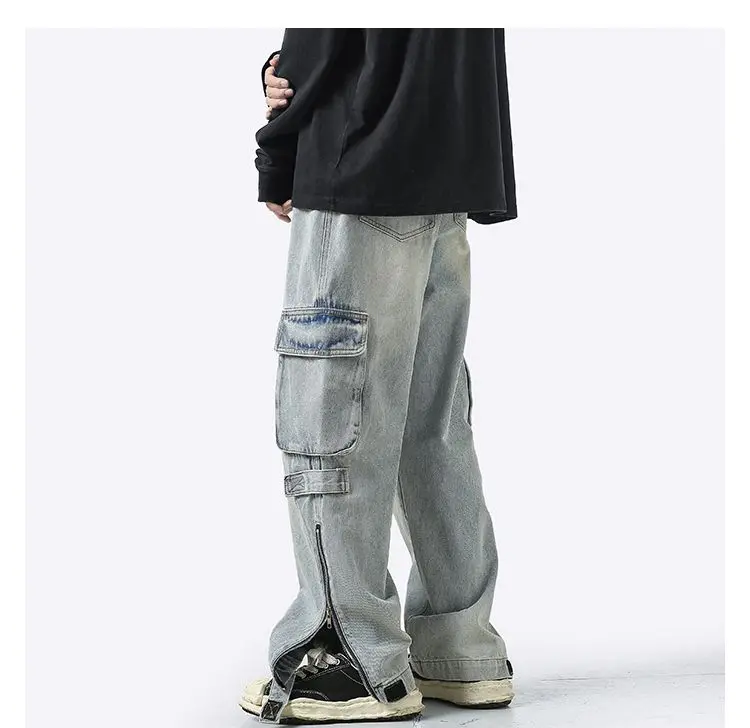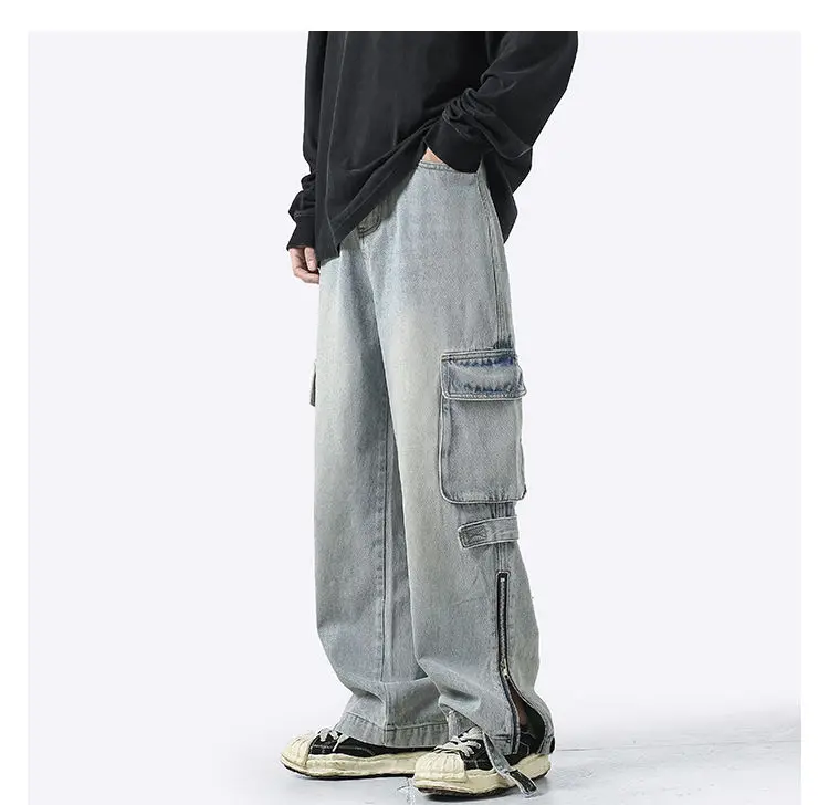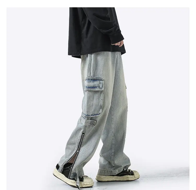 American retro jeans men and women zipper trousers large pockets high street overalls loose trousers comfortable wide leg pants