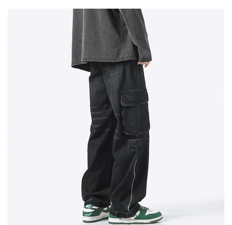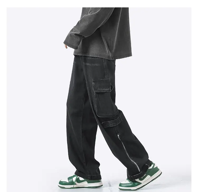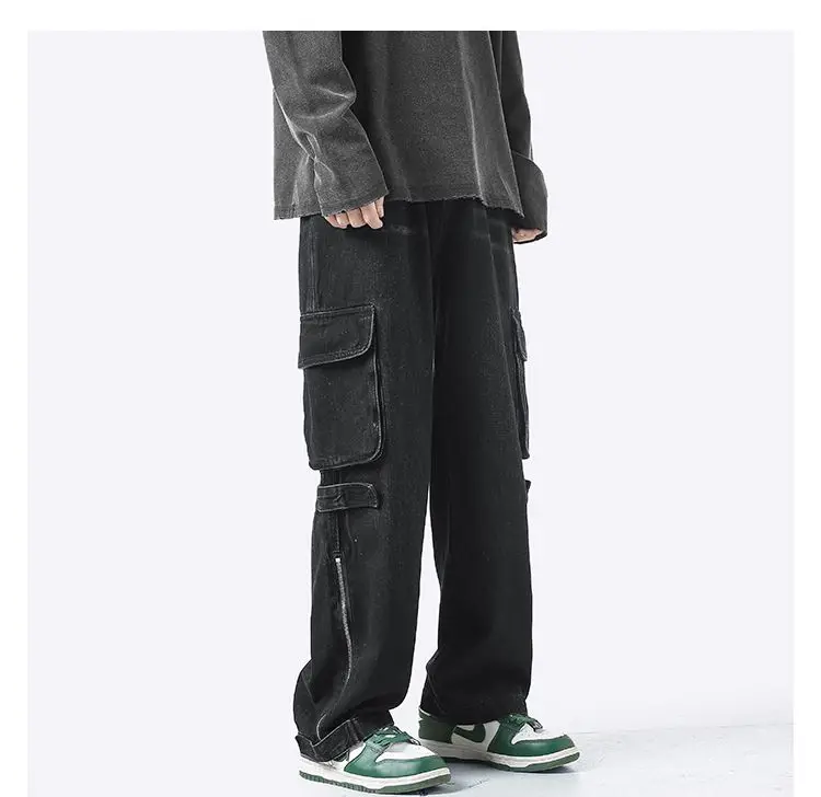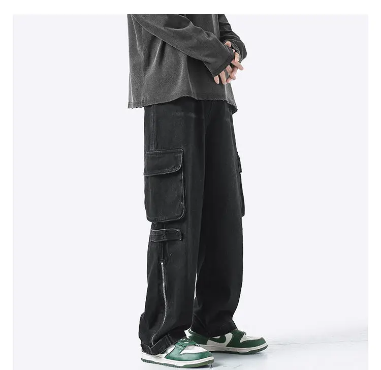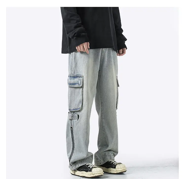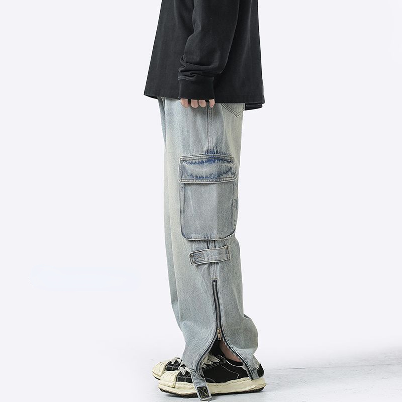 American retro jeans men and women zipper trousers large pockets high street overalls loose trousers comfortable wide leg pants