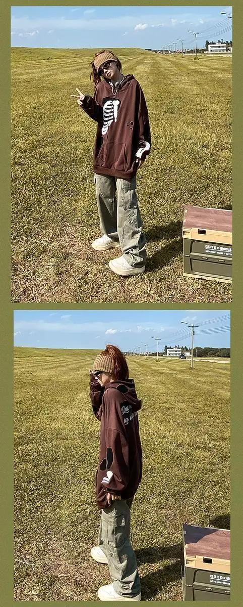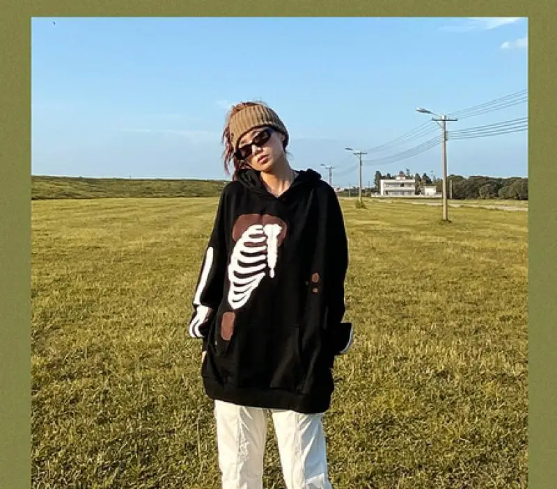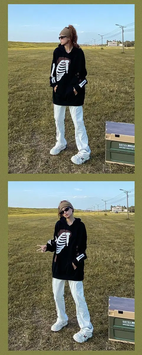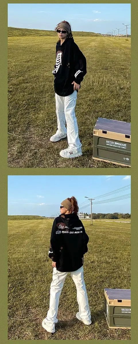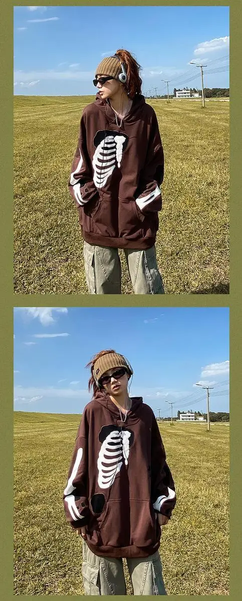 American retro street Y2K patch skull print hooded sweater sweatshirt men and women oversize niche high street jacket jacket ins