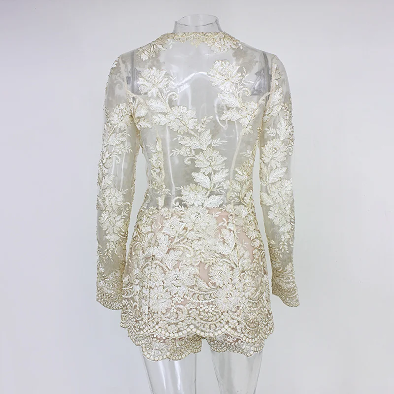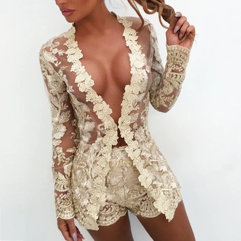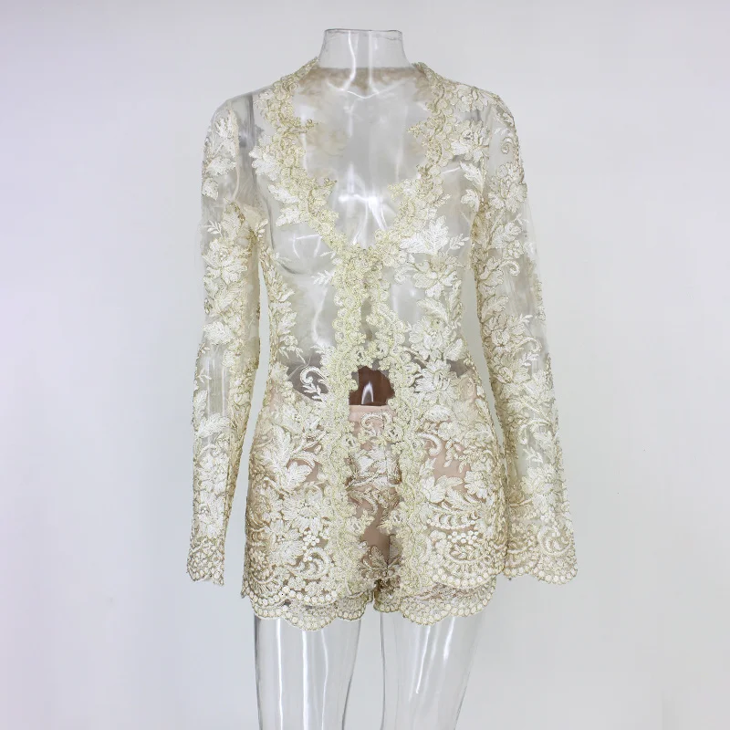 BaQGW Vintage Floral Embroidery Sexy Two Piece Sets Women Lace V Neck Hollow Out Cardigan + Shorts Nightclub See Through Outfits