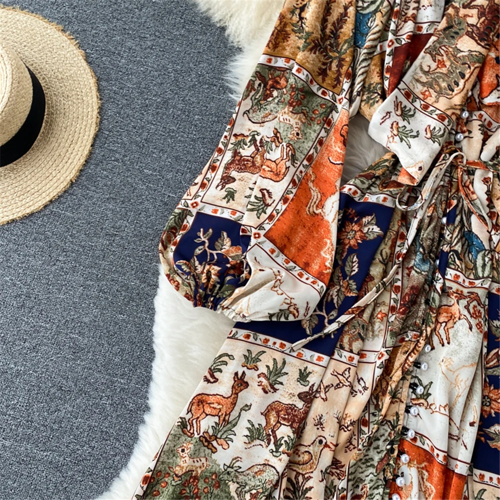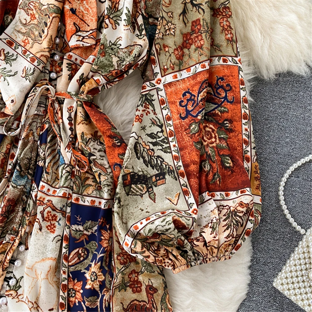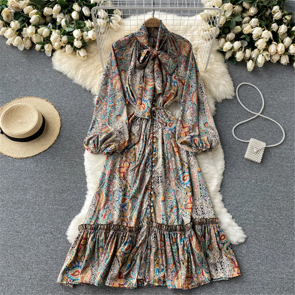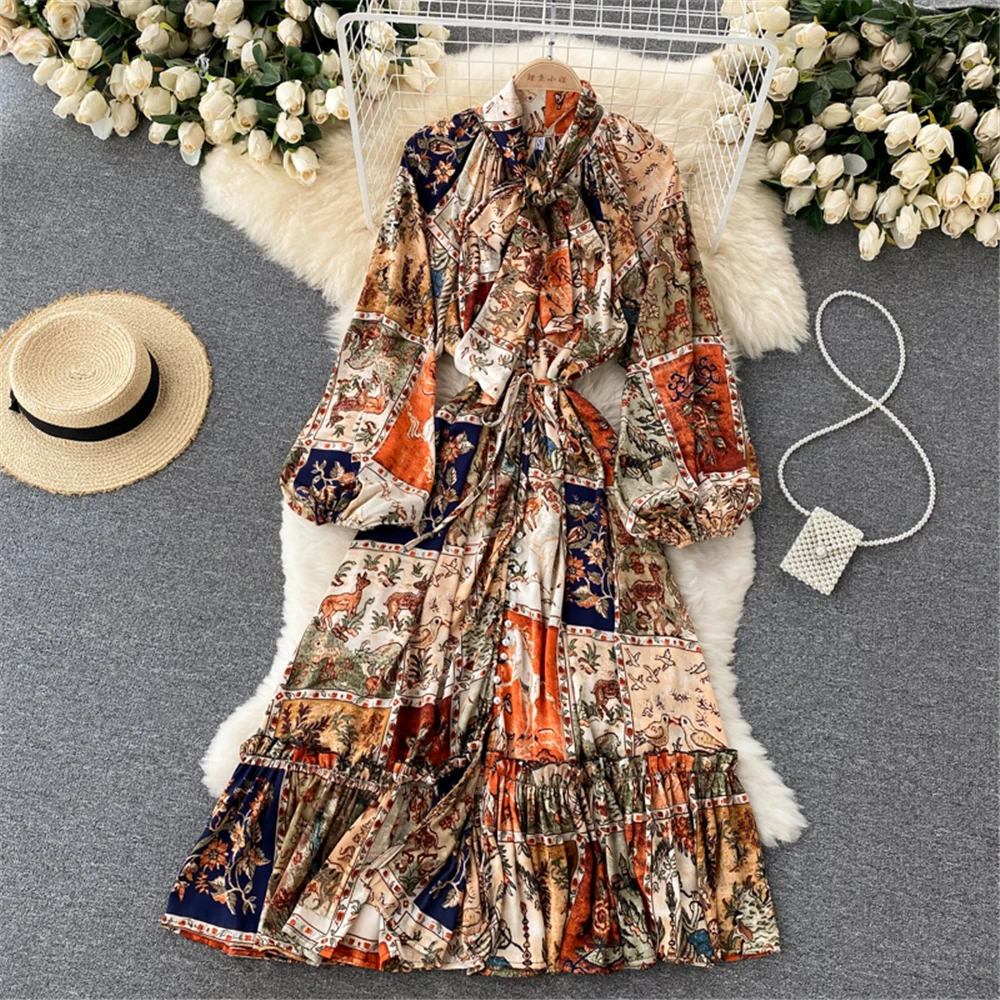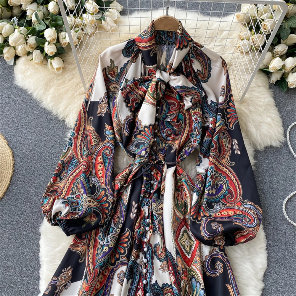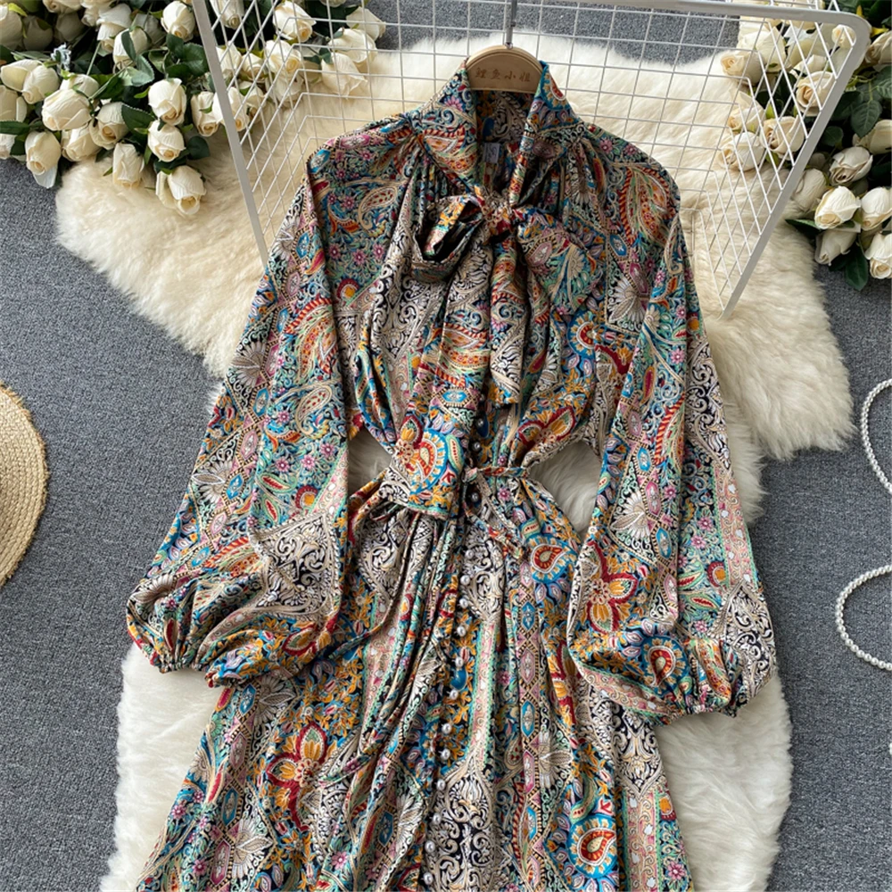 Boho Indie Folk Women Printed Loose Dress Autumn Fashion Bandage Long Sleeve Pleated Dresses Vintage Vestidos Female Clothing