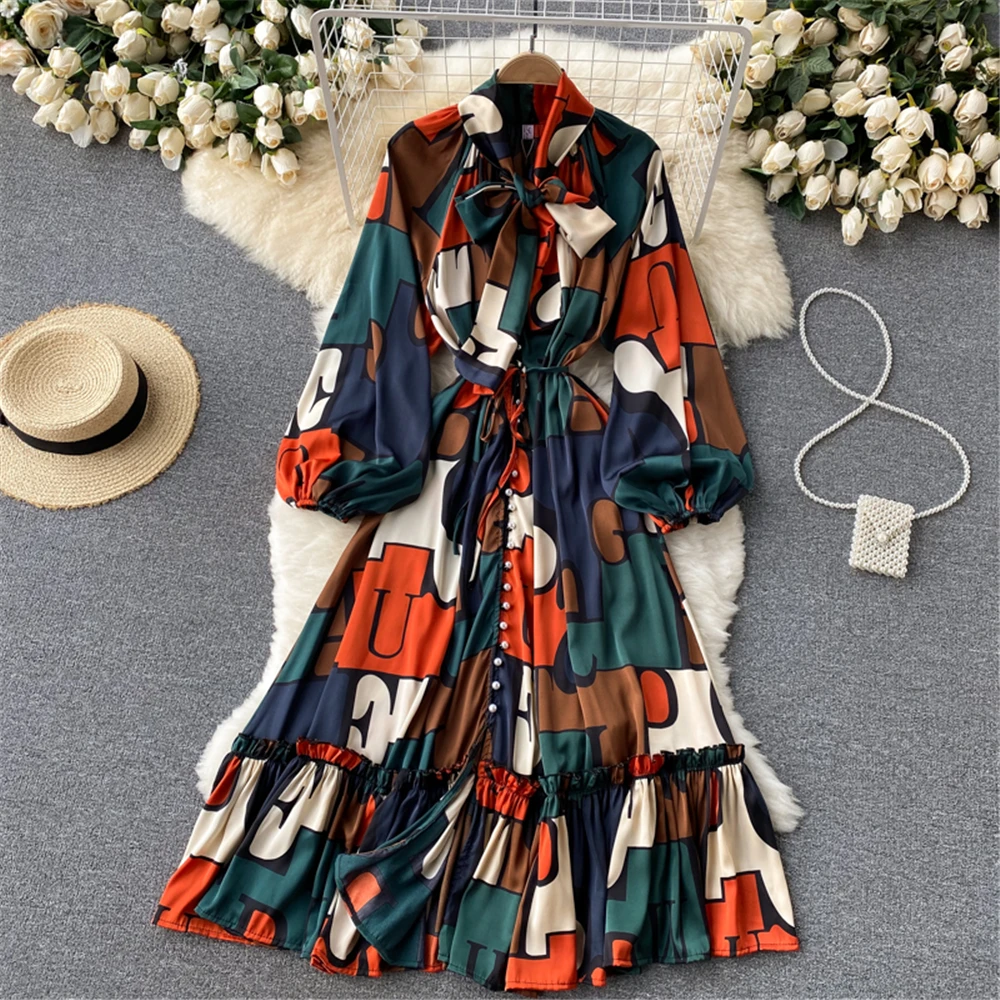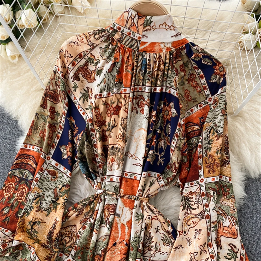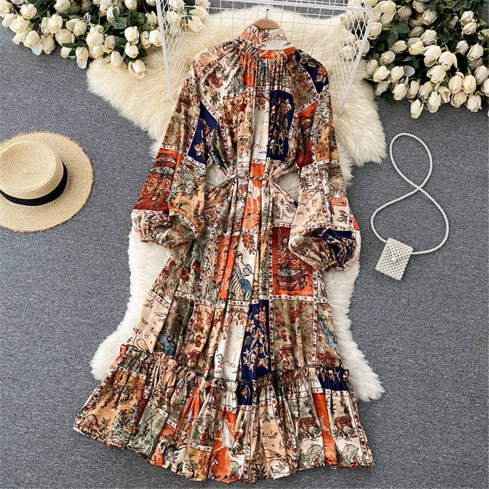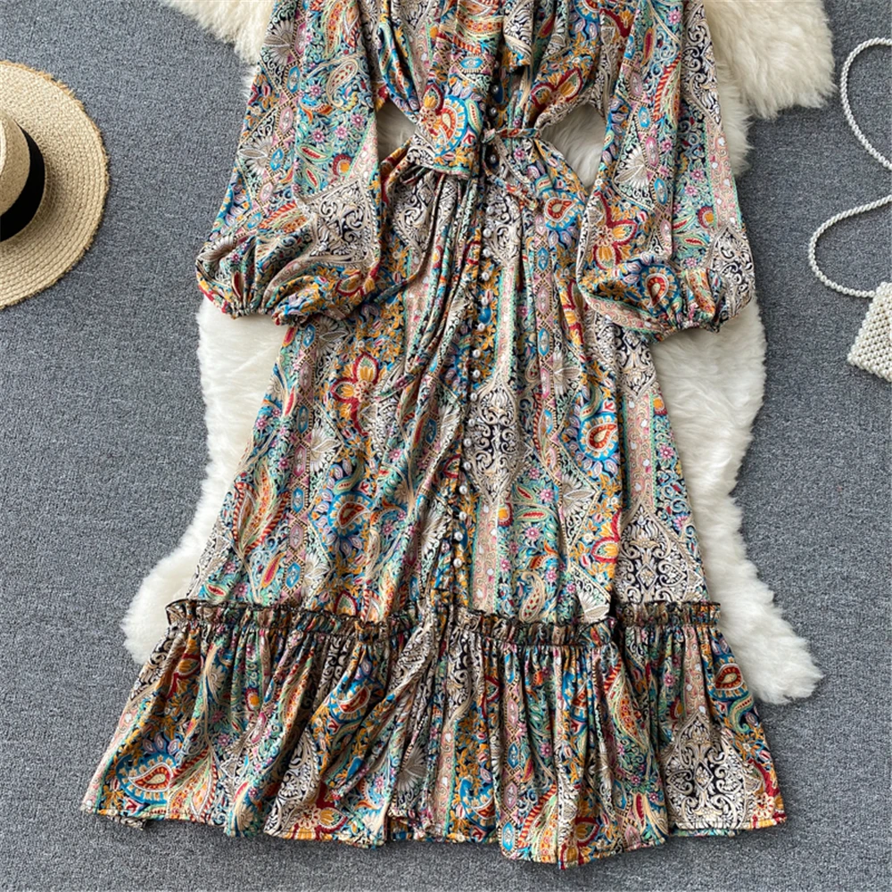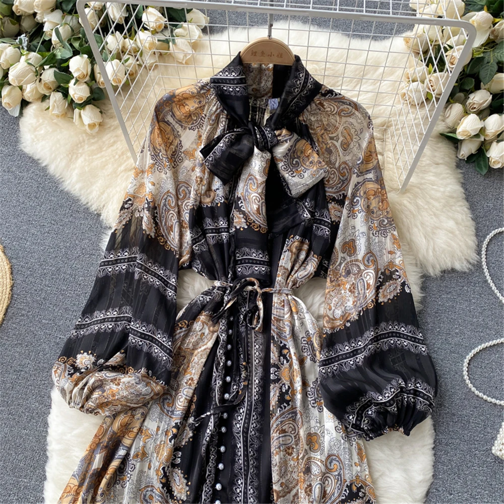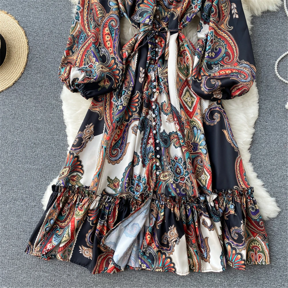 Boho Indie Folk Women Printed Loose Dress Autumn Fashion Bandage Long Sleeve Pleated Dresses Vintage Vestidos Female Clothing