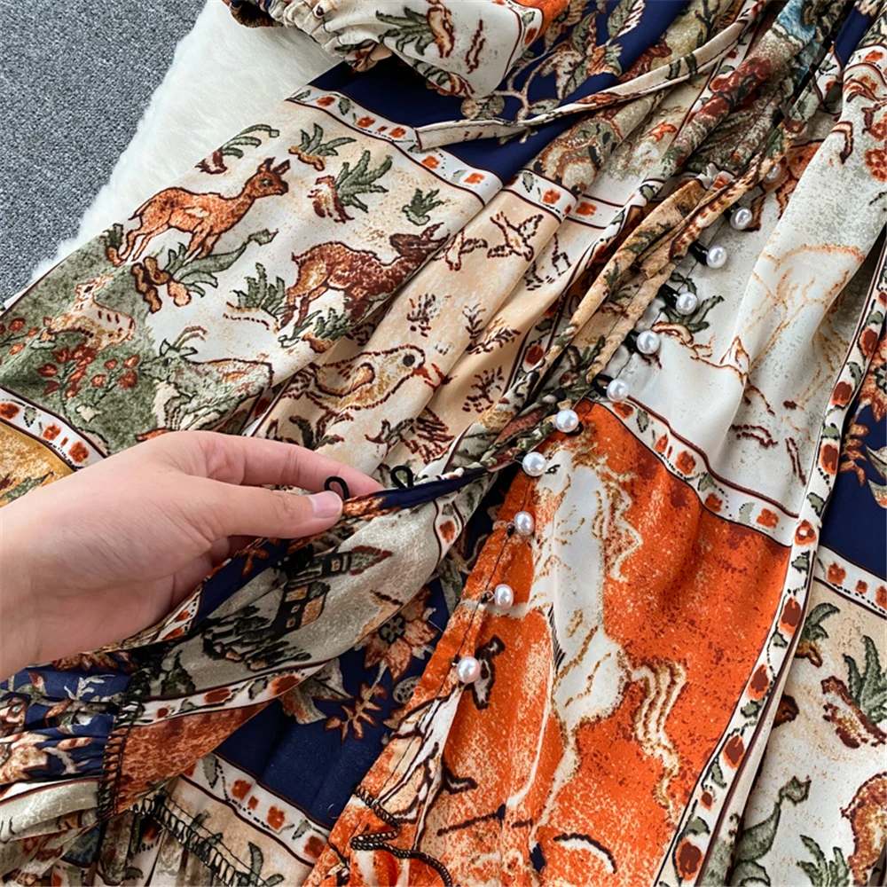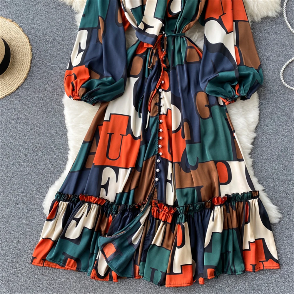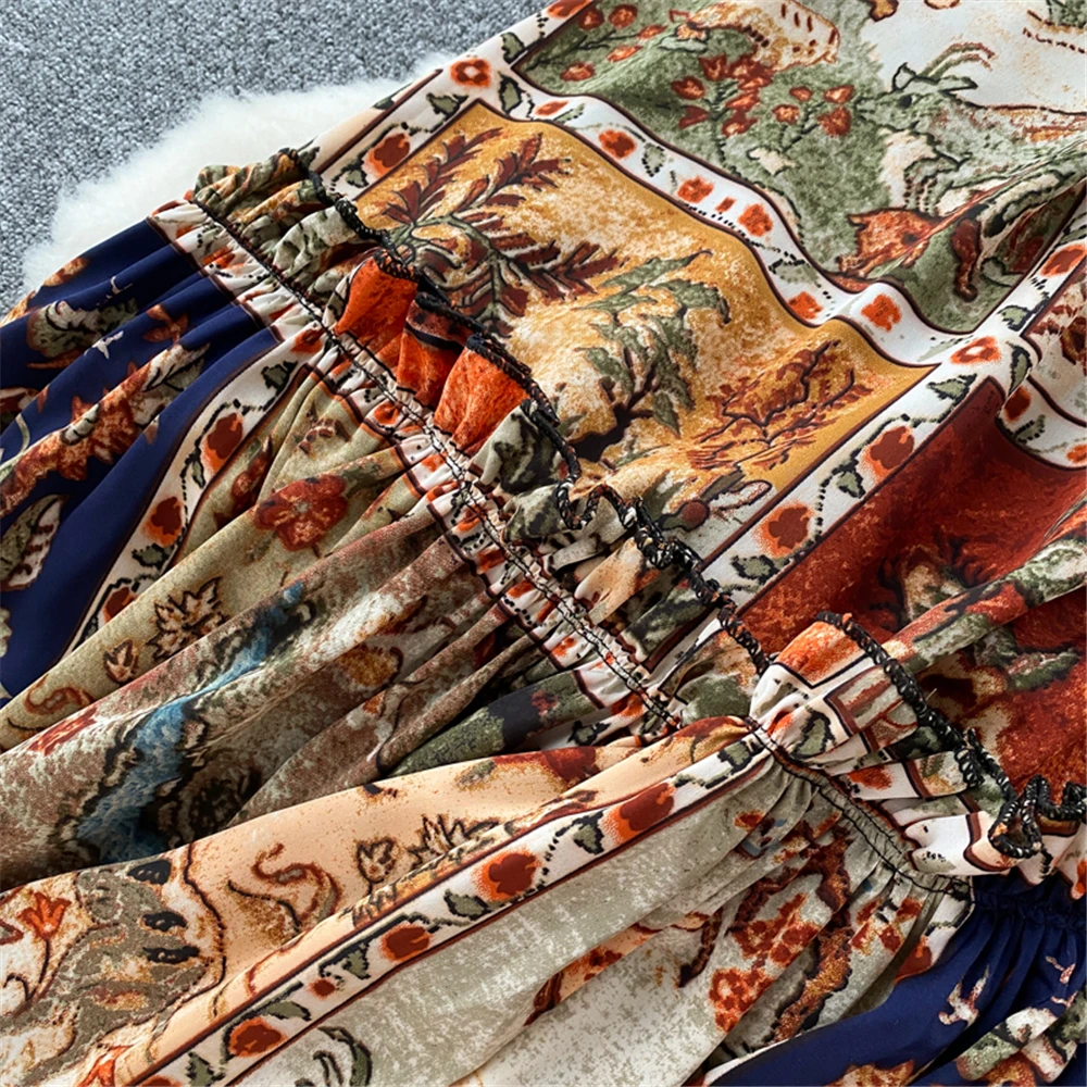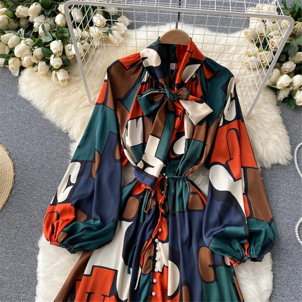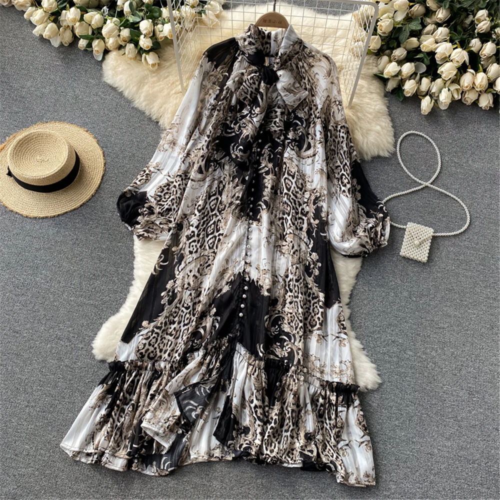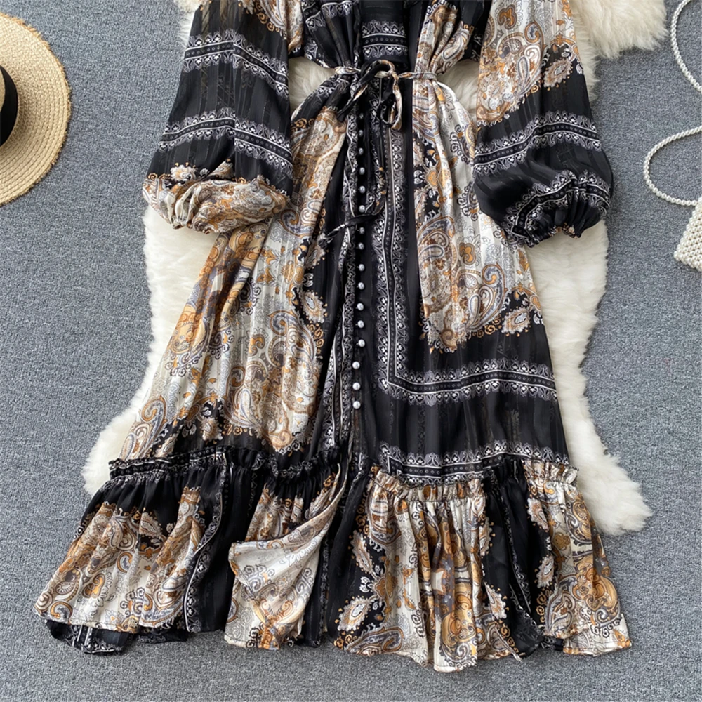 Boho Indie Folk Women Printed Loose Dress Autumn Fashion Bandage Long Sleeve Pleated Dresses Vintage Vestidos Female Clothing