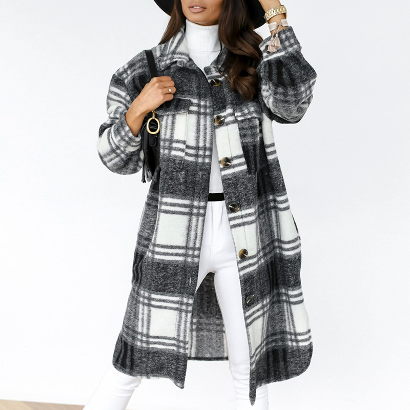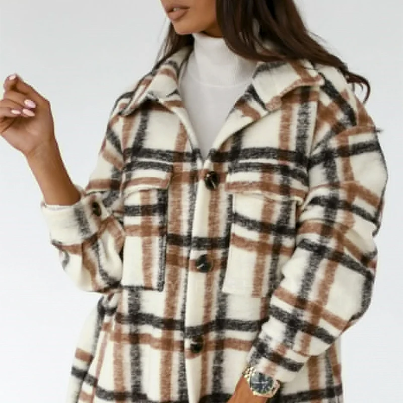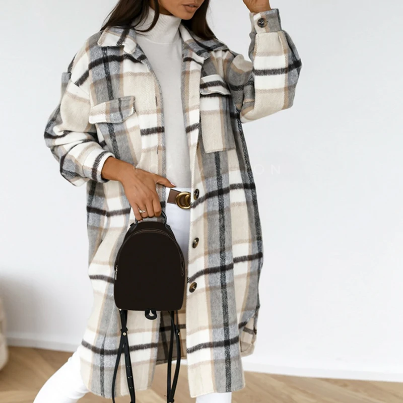 Casual Spring Plaid Long Blouse Women High Street Lantern Sleeves Shirt Pocket Button Ladies Outwear Shirts Loose 2021