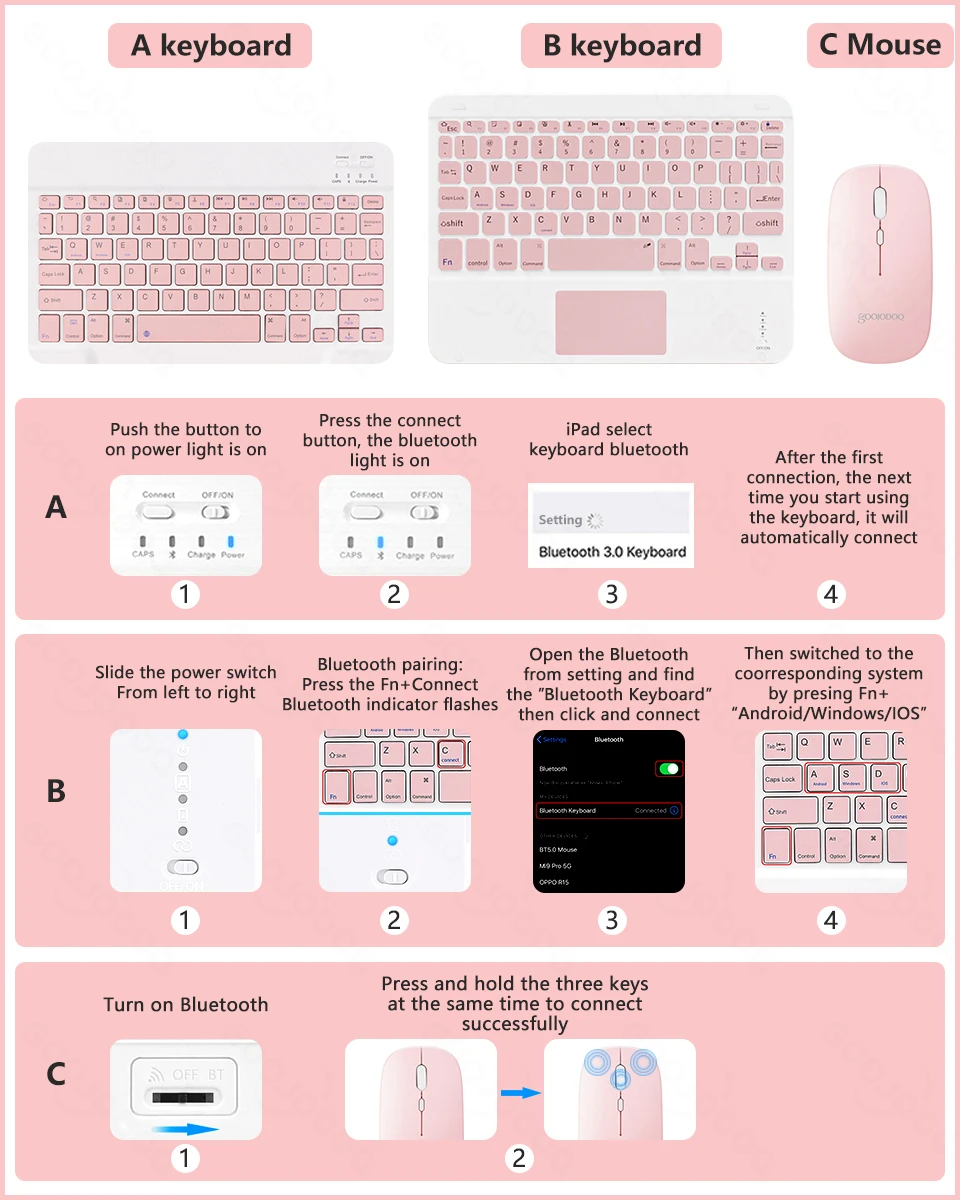 2. Bluetooth pairing: Press the Fn+C (the bluetooth indicator will flashes);
