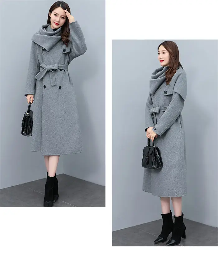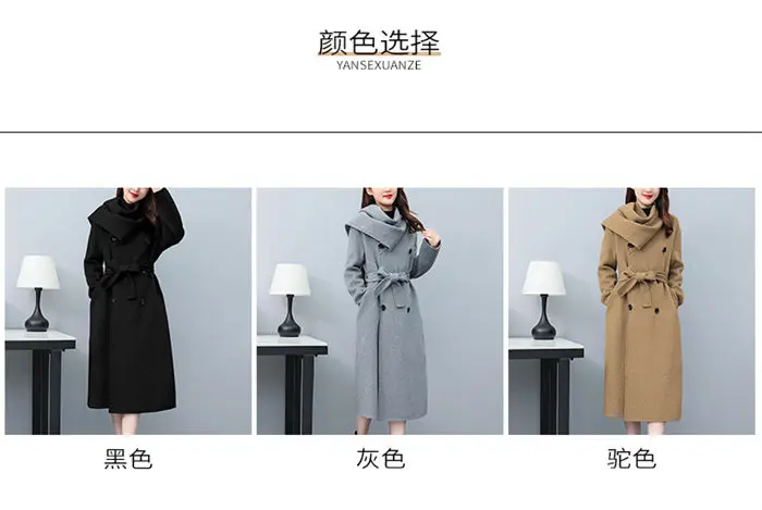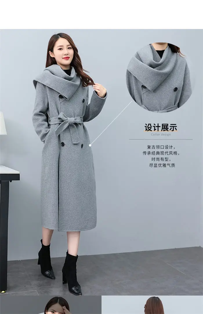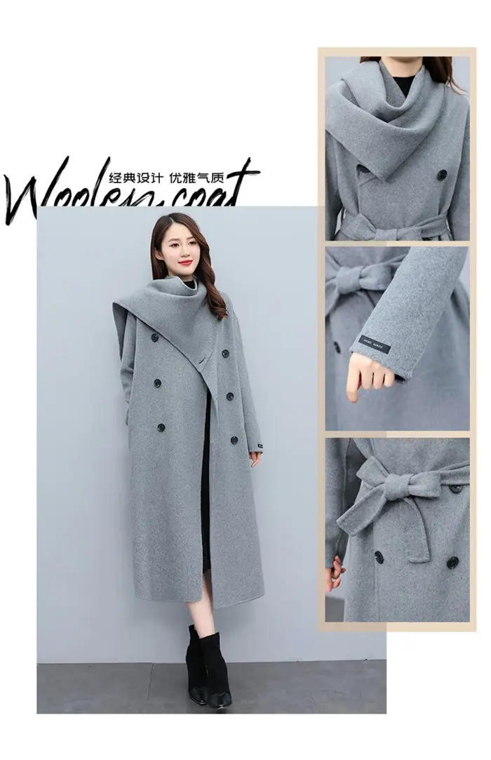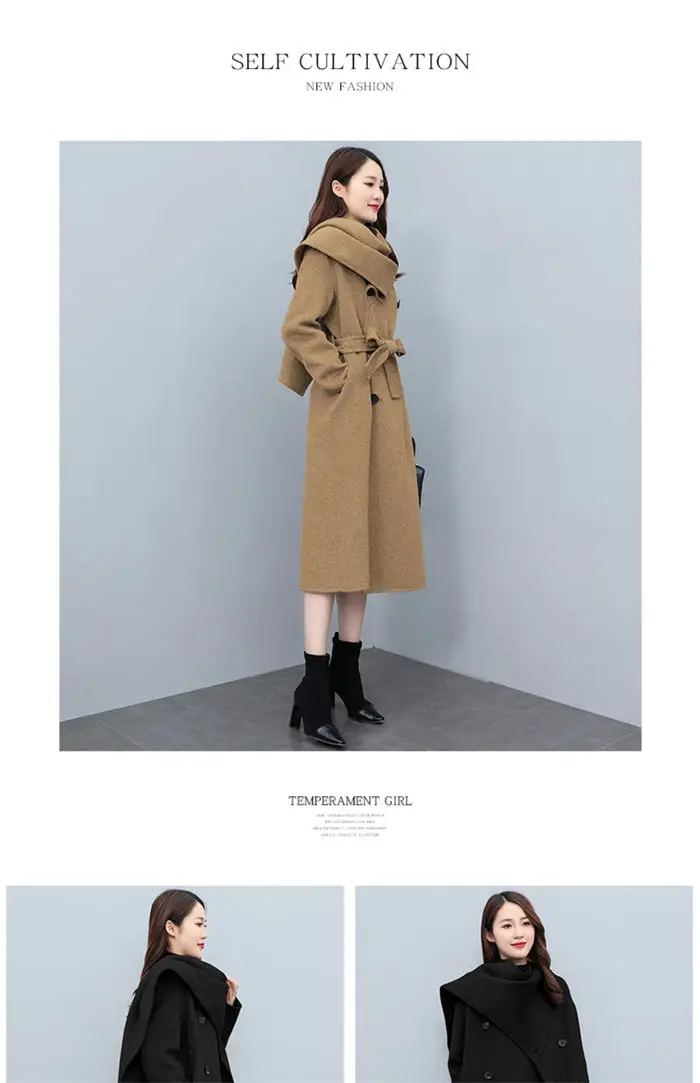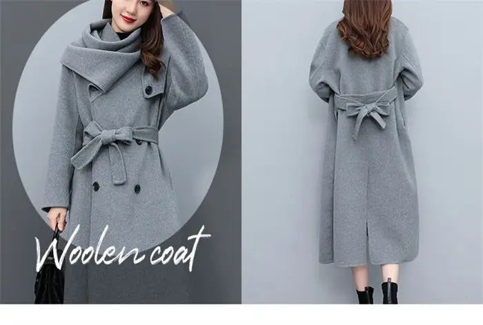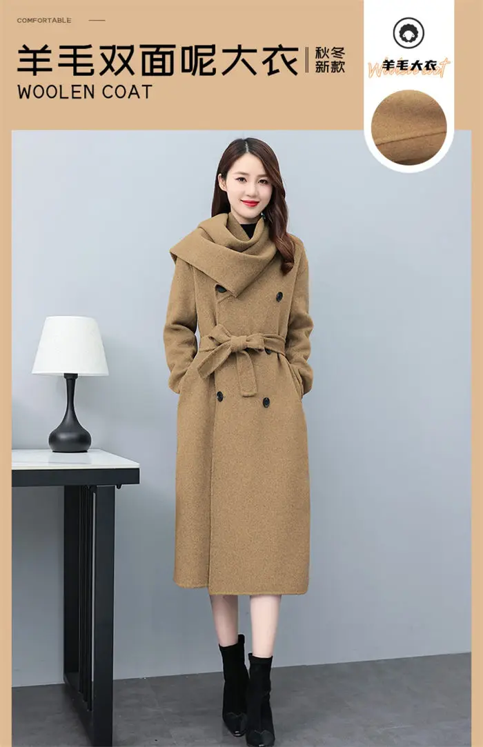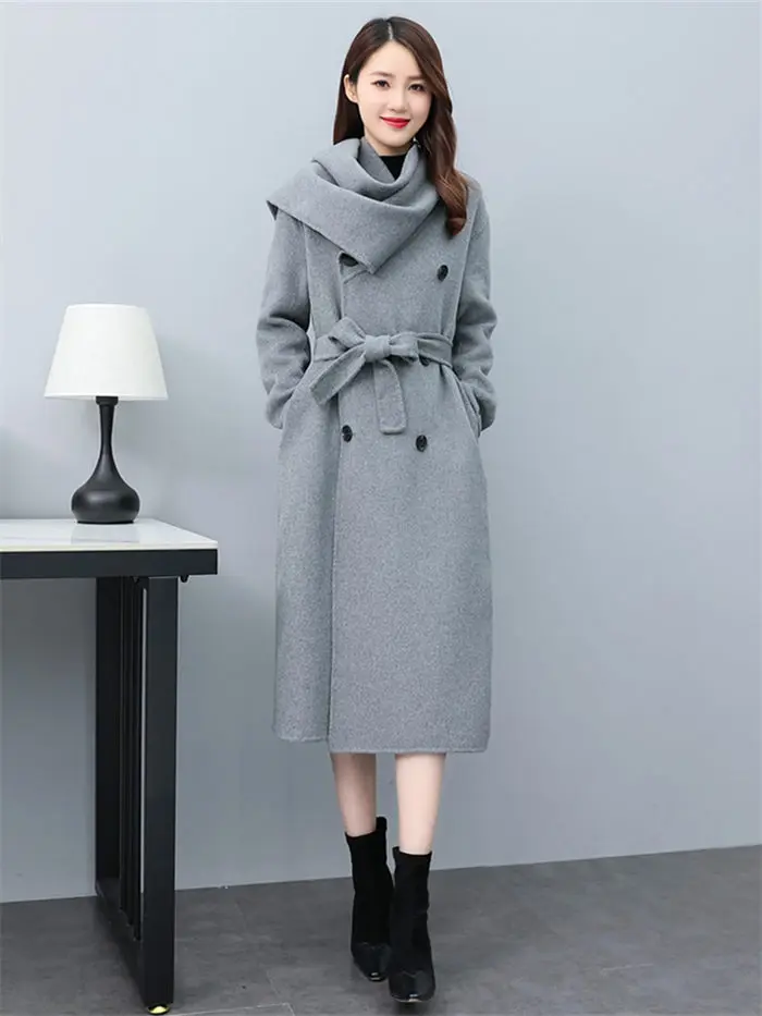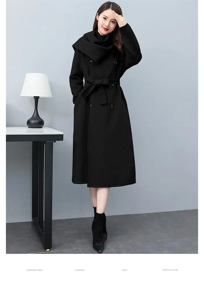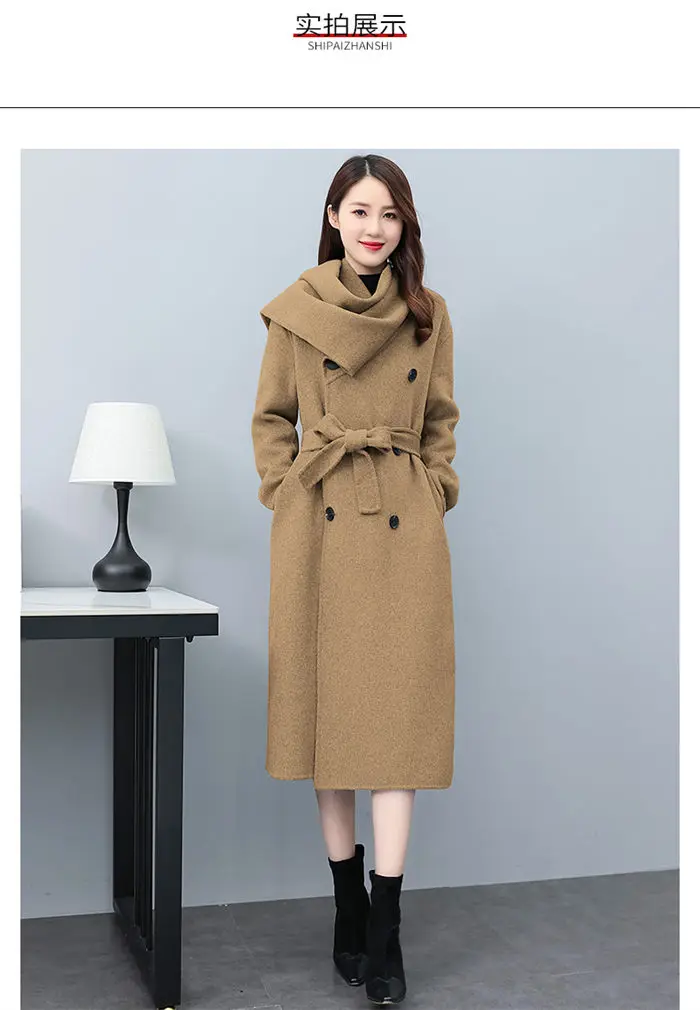 Korean High-End Scarf Collar Coat Double Breasted Sashes Woolen Long Temperament Women Autumn Winter Windbreaker Jacket T1078