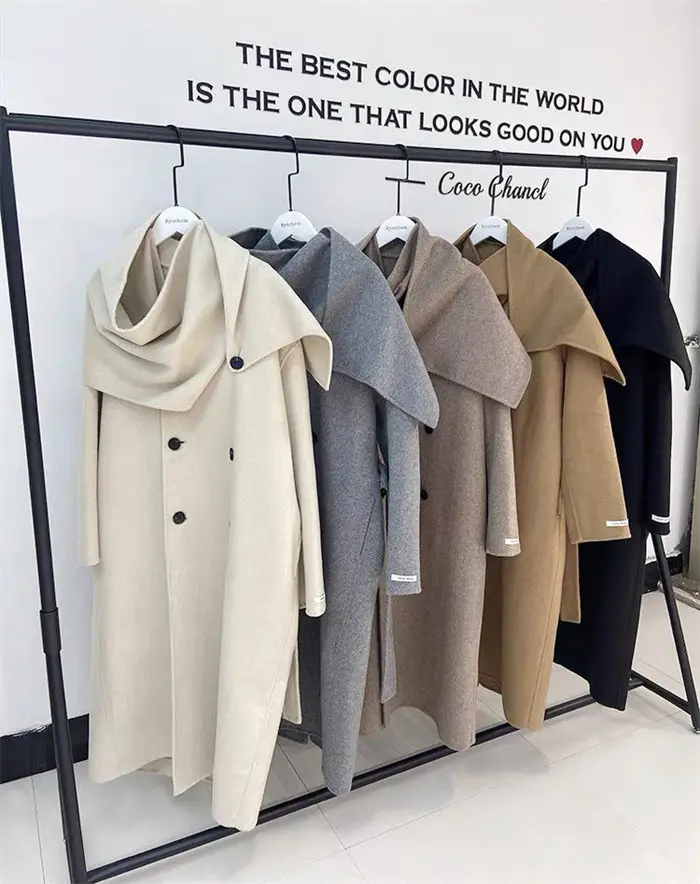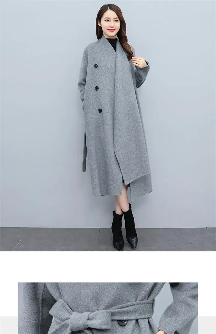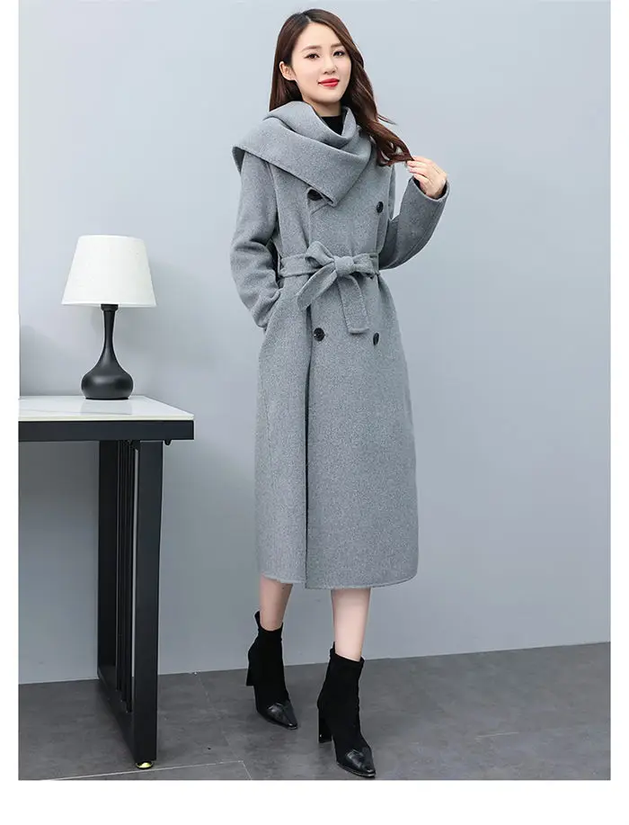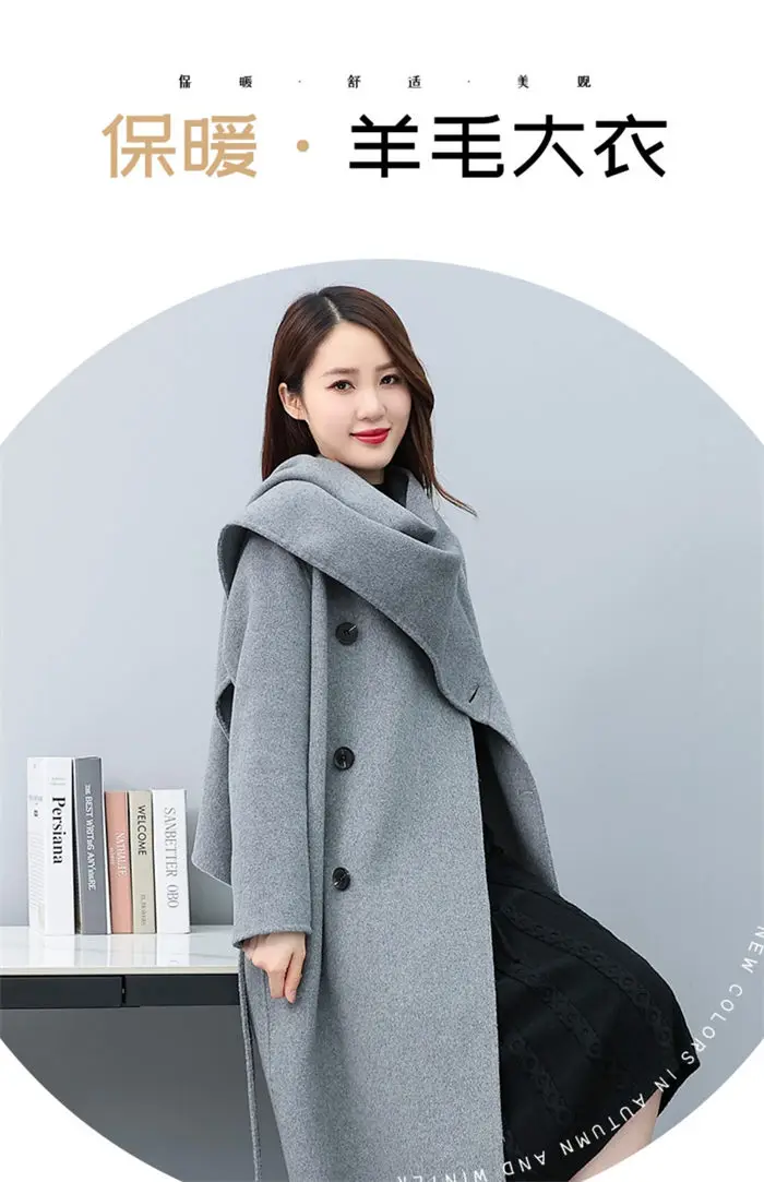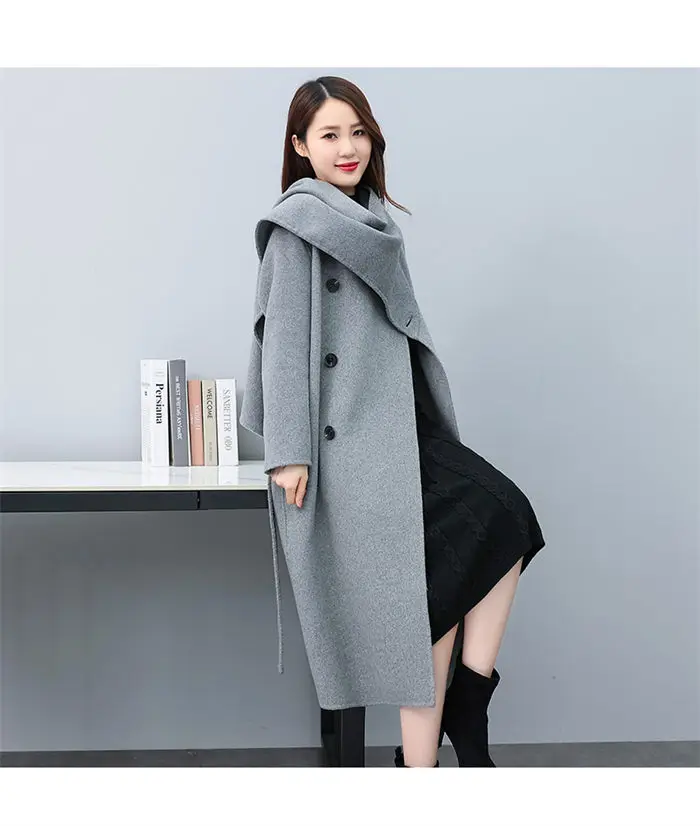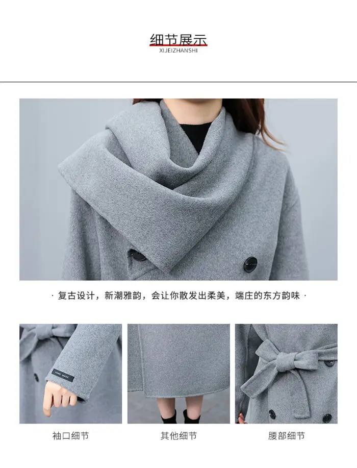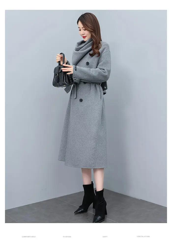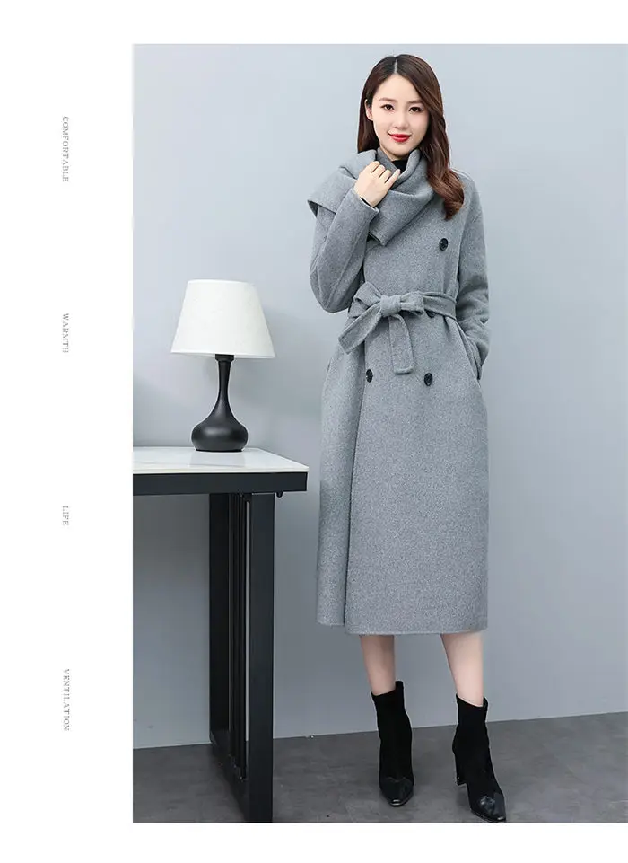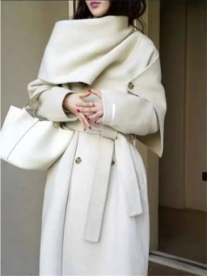 Korean High-End Scarf Collar Coat Double Breasted Sashes Woolen Long Temperament Women Autumn Winter Windbreaker Jacket T1078