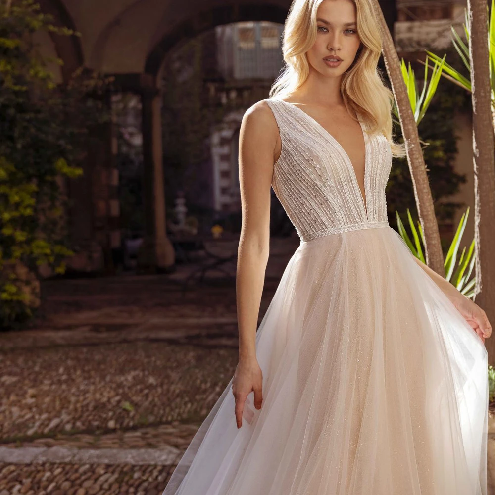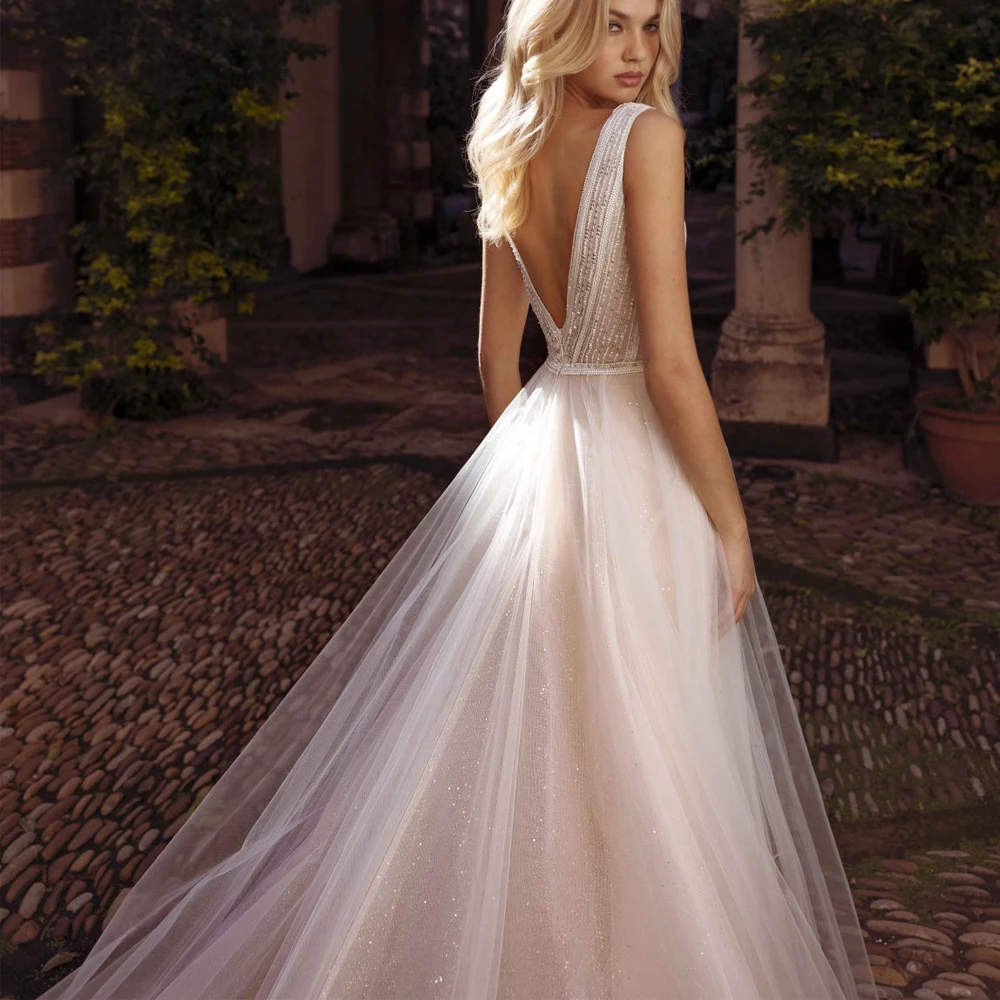 Home / LaBoum Glitter V-Neck Tulle Wedding Dresses Beaded Sleeveless A-Line Bridal Gowns Modern V-Back Robe Mariage Femme Floor Length