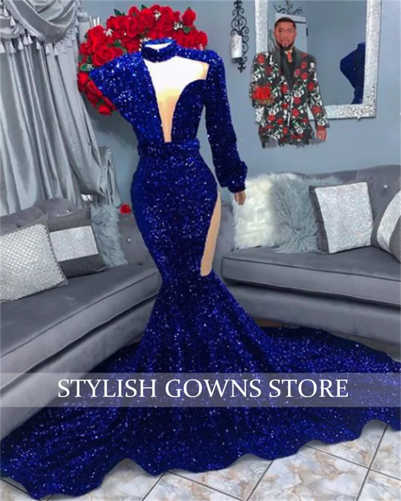Navy Blue Mermaid Long Prom Dresses Sequined Formal Dress High Neck Birthday Party Gown Cut Out Vestido De Festa Casamento
