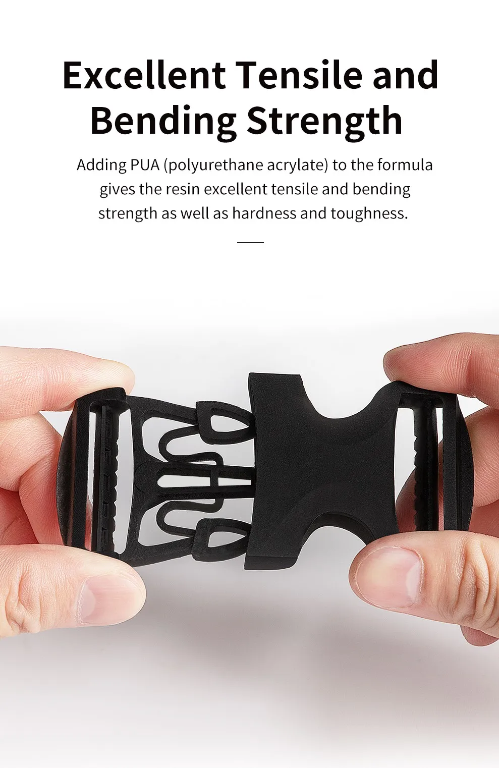Excellent tensile and bending strengthAdding PUA (polyurethane acrylate) to the formula gives the resin excellent tensile and bending strength as well as hardness and toughness.