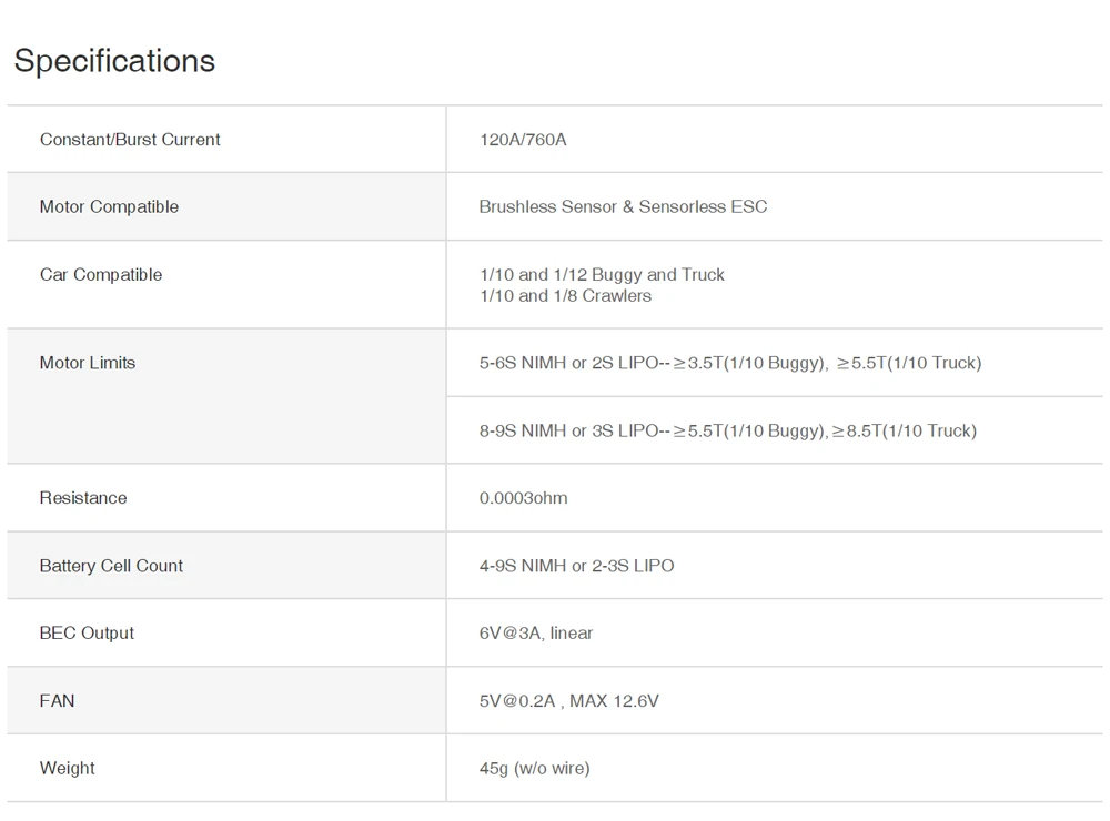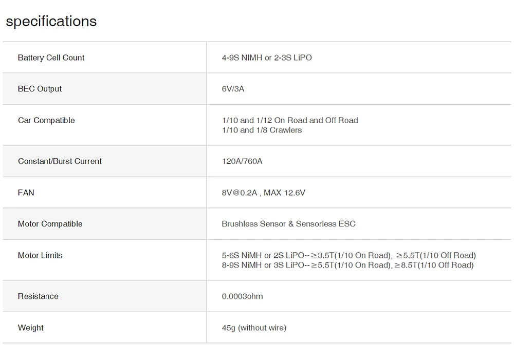 8-9S NIMH or 3S LIPO-≥5.5T(1/10 On Road), ≥8.5T(1/10 Off Road)