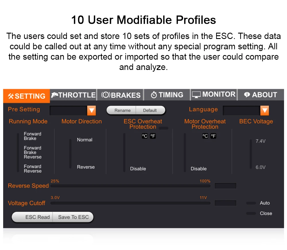 【10 sets Data】:The user could set and store 10 sets of profiles in the ESC. These data could be called out at any time without any special program setting. All the setting can be exported or imported so that the user could compare and analyze.