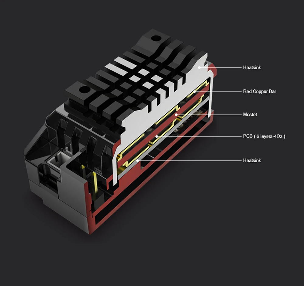 【Stable Operation】: Red copper connector is used internal of the ESC. It can decrease the internal resistance at high current situation and the thermal resistance.