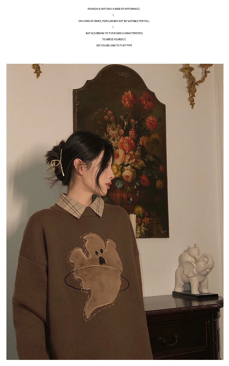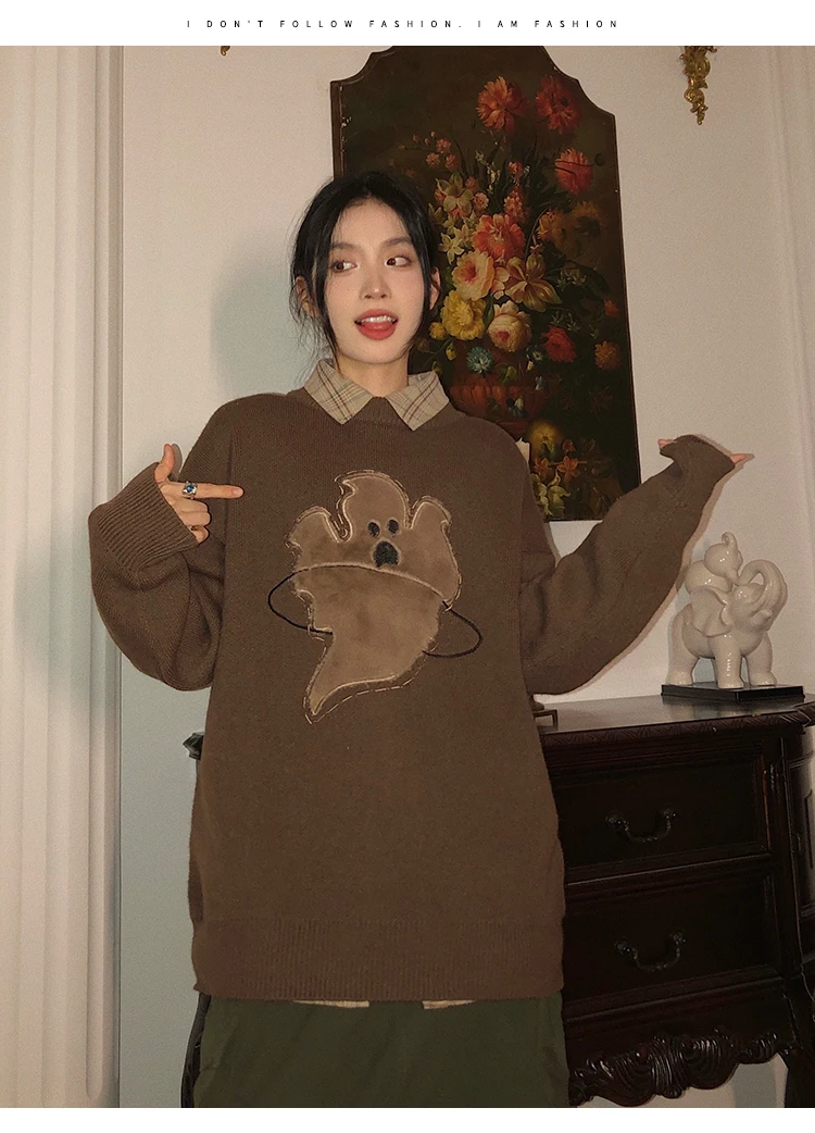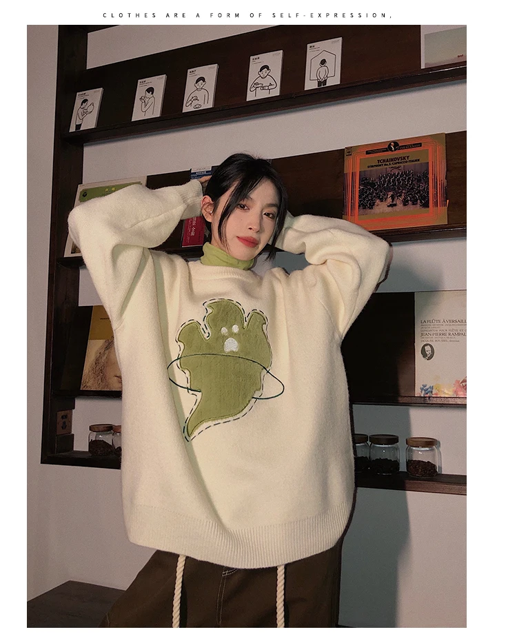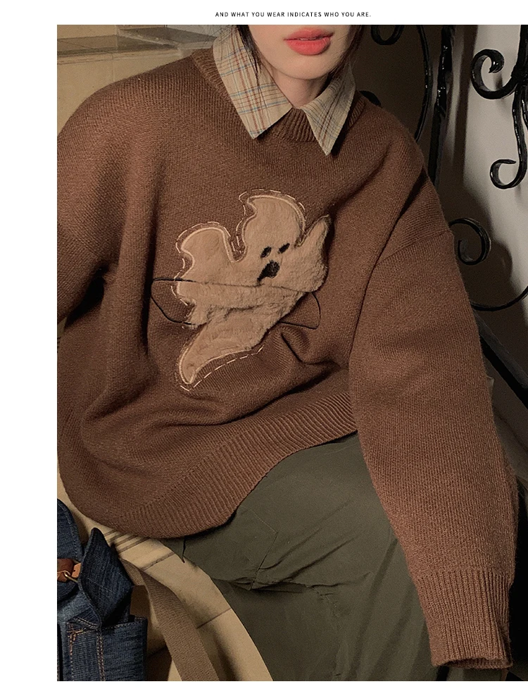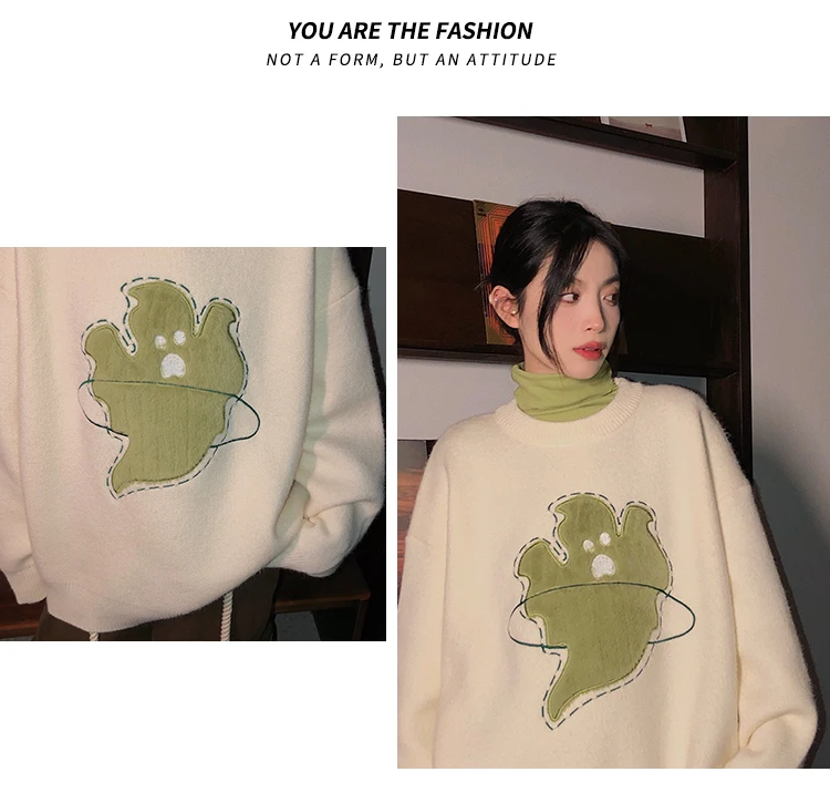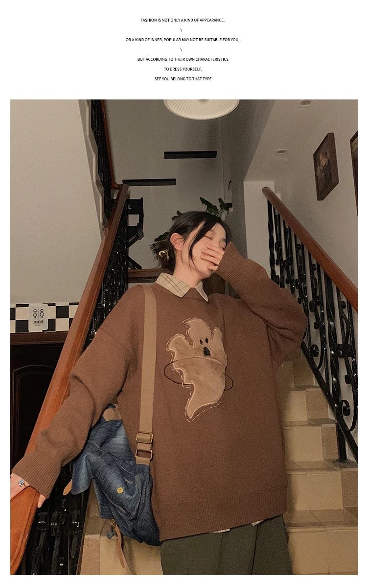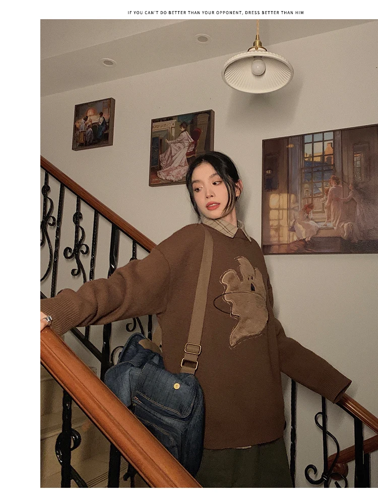 Vintage Women Apricot Sweater Round Neck Embroidery Fashion Leisure Lazy Wind Loose Winter Female Thicken Warm Knitting Pullover