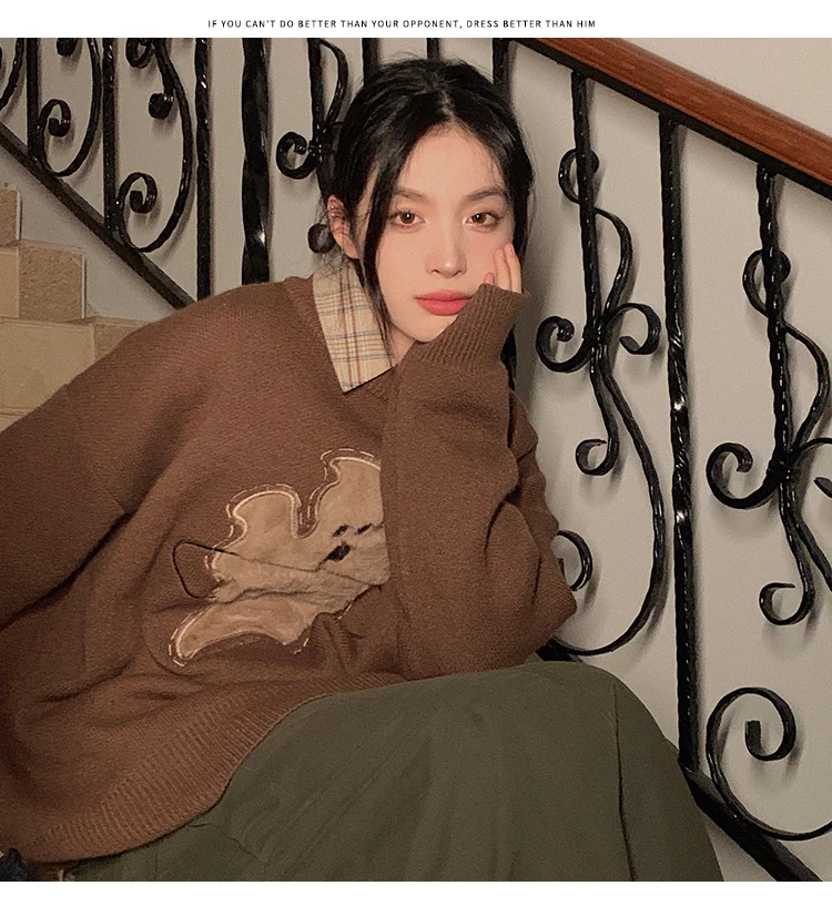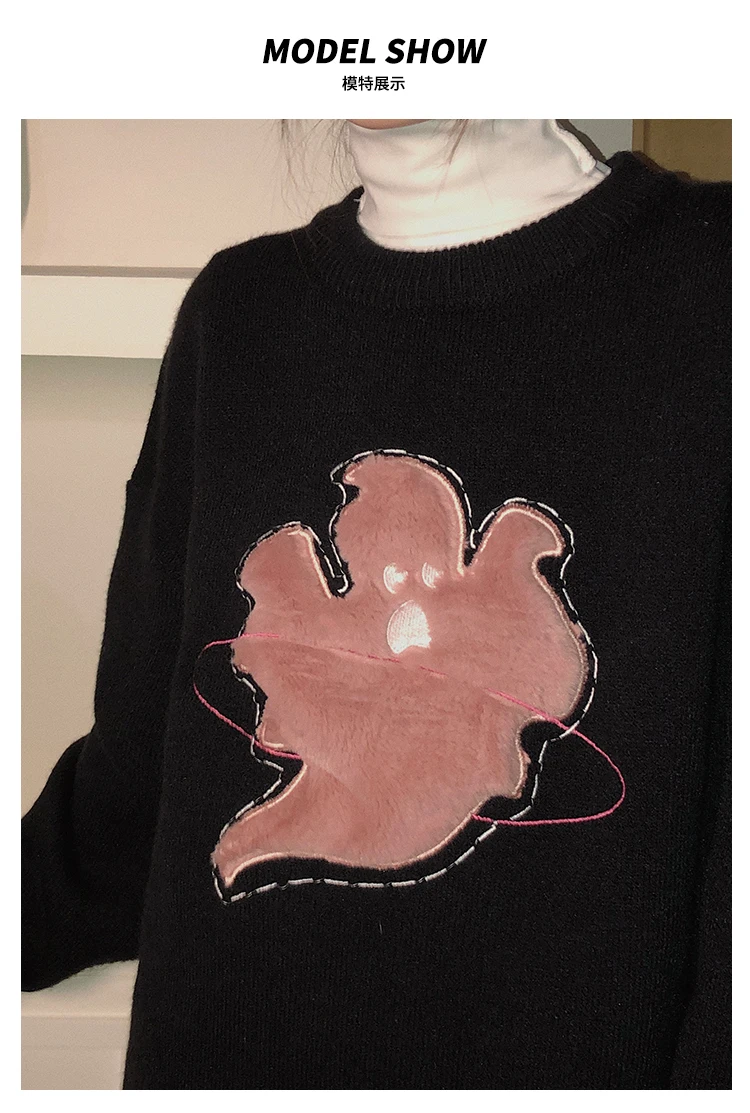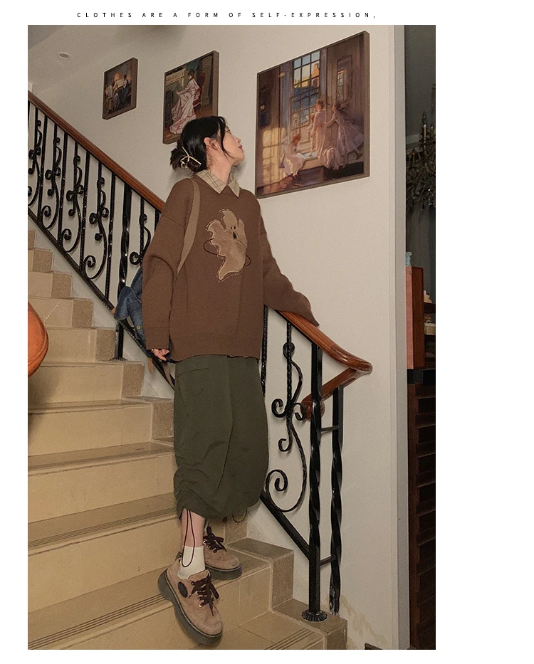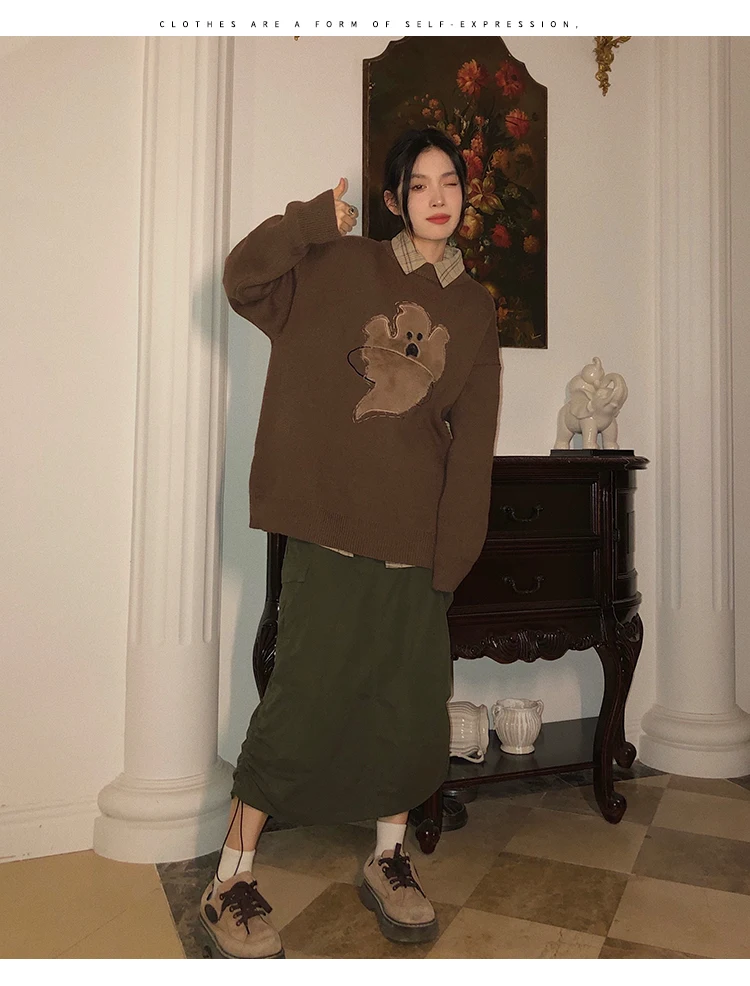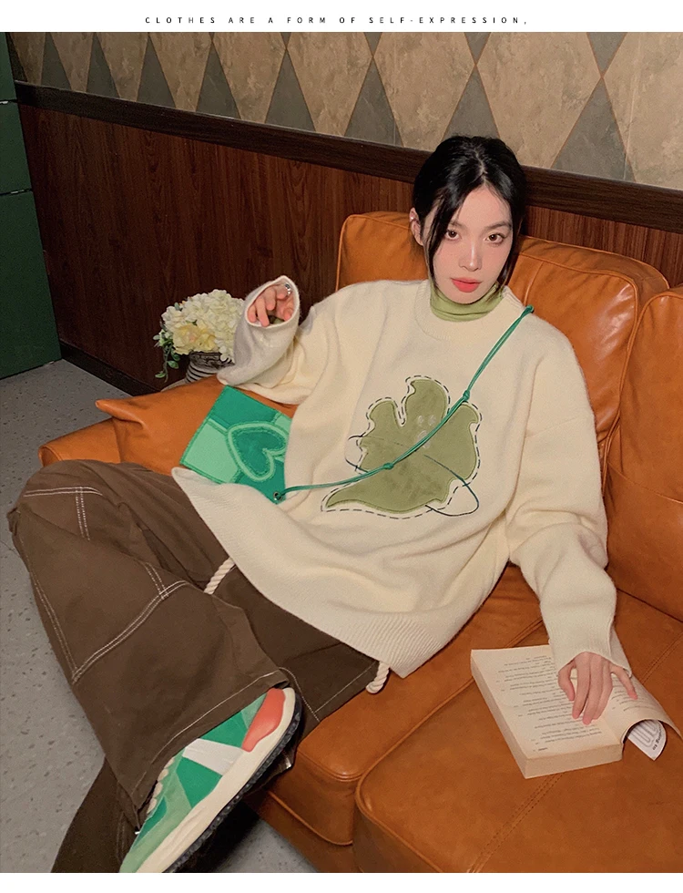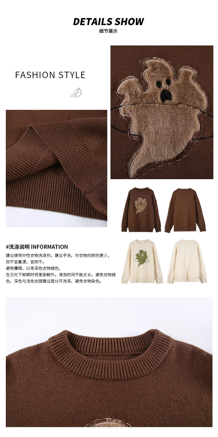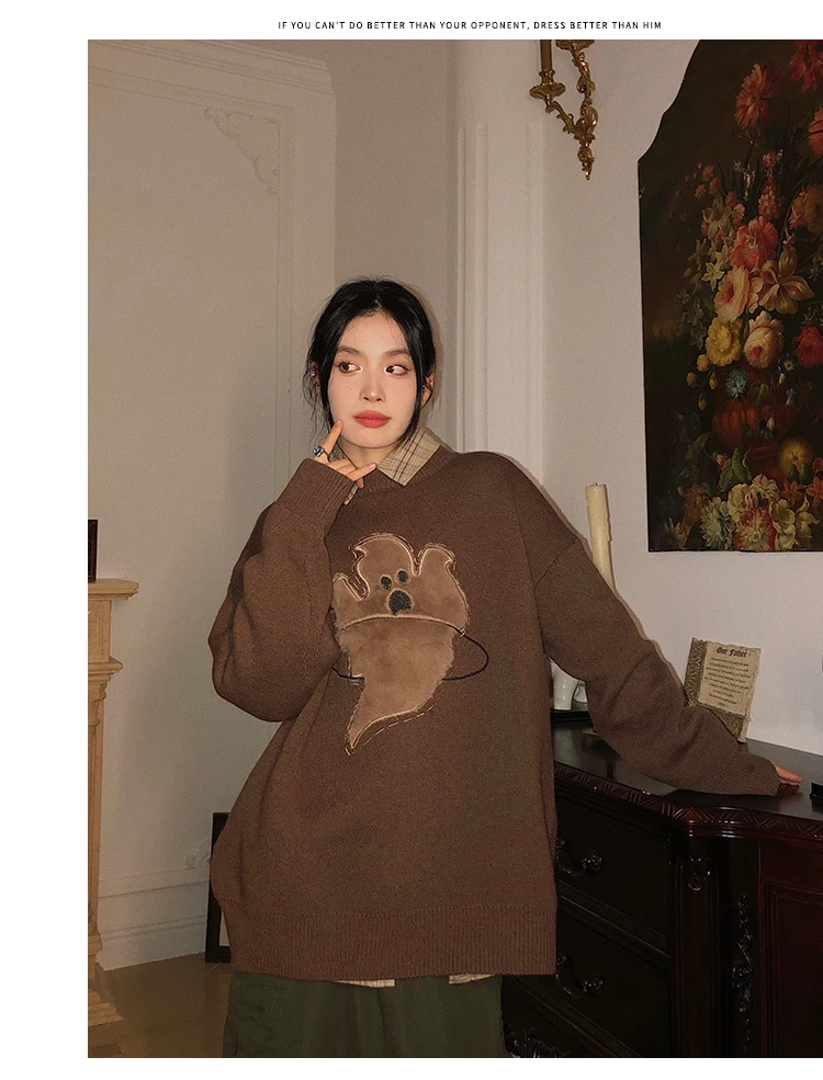Vintage Women Apricot Sweater Round Neck Embroidery Fashion Leisure Lazy Wind Loose Winter Female Thicken Warm Knitting Pullover