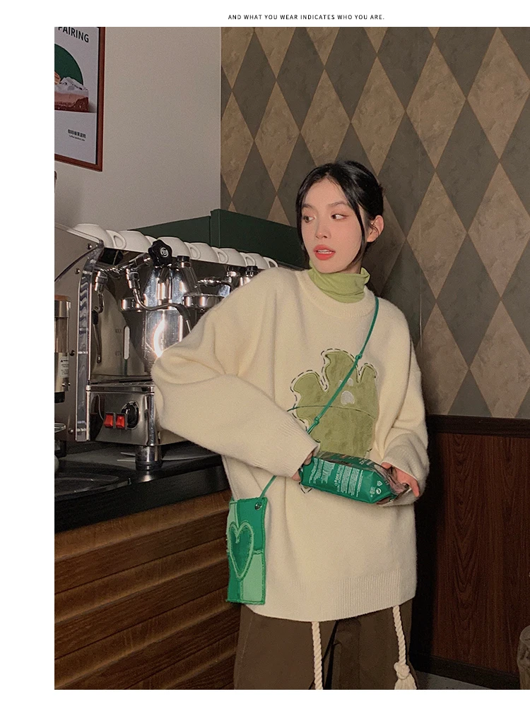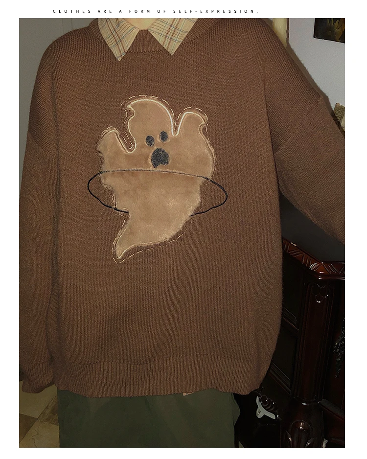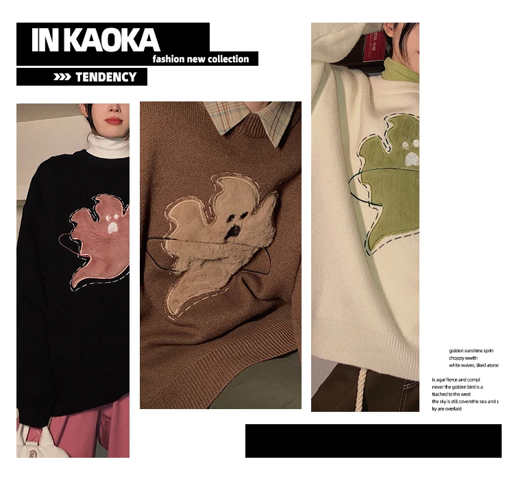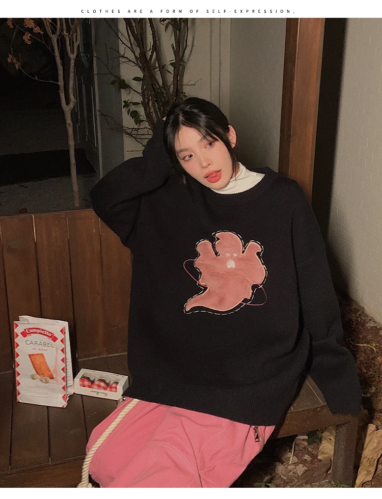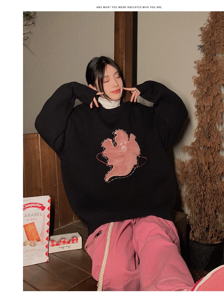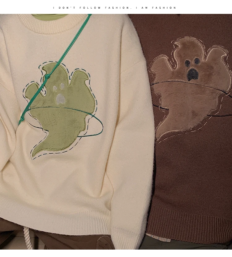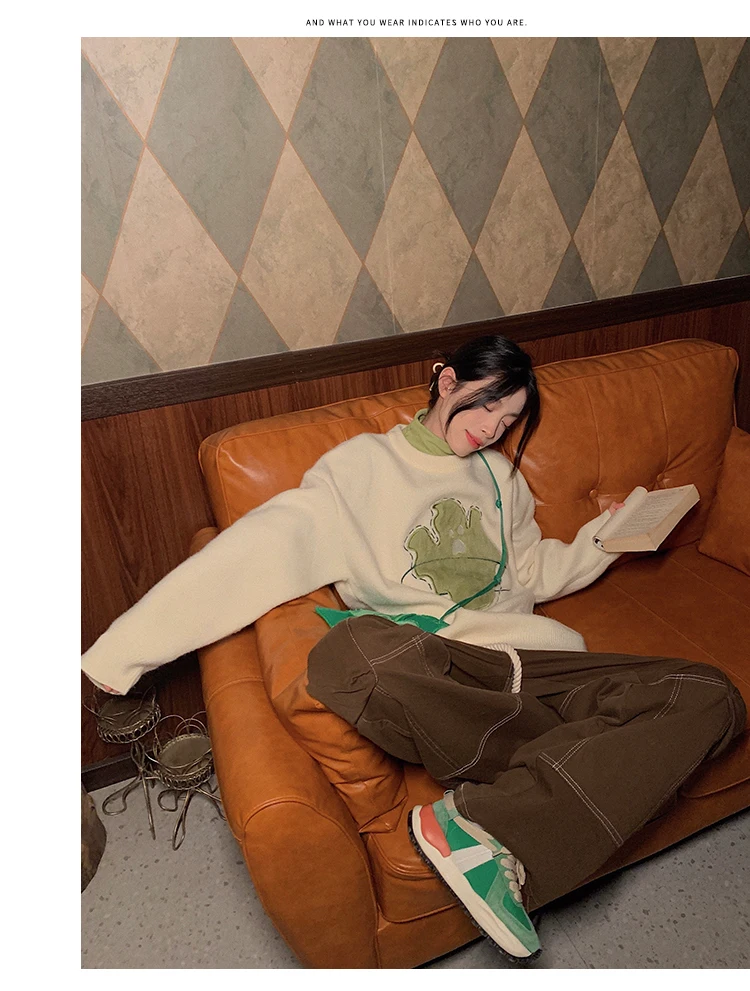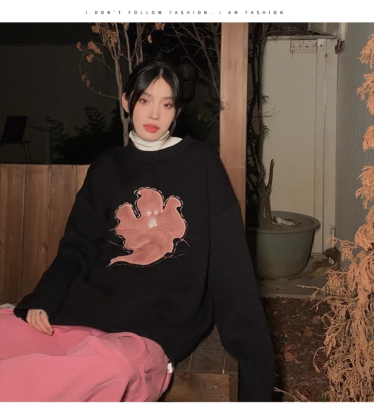 Vintage Women Apricot Sweater Round Neck Embroidery Fashion Leisure Lazy Wind Loose Winter Female Thicken Warm Knitting Pullover