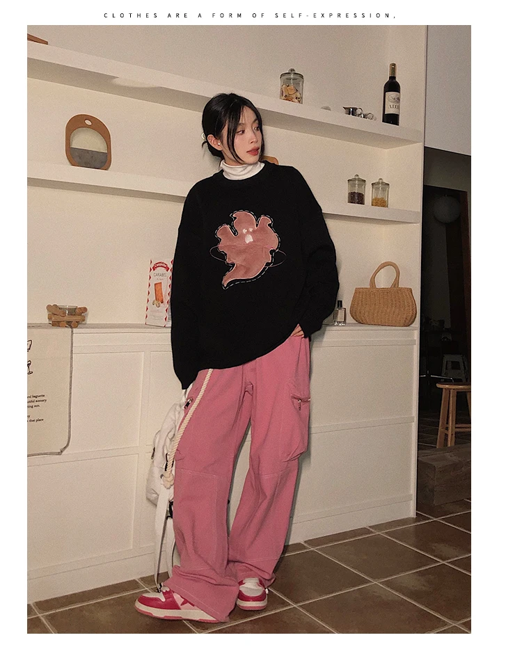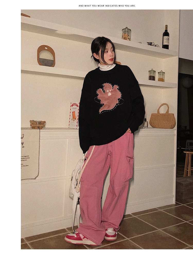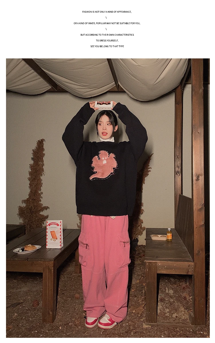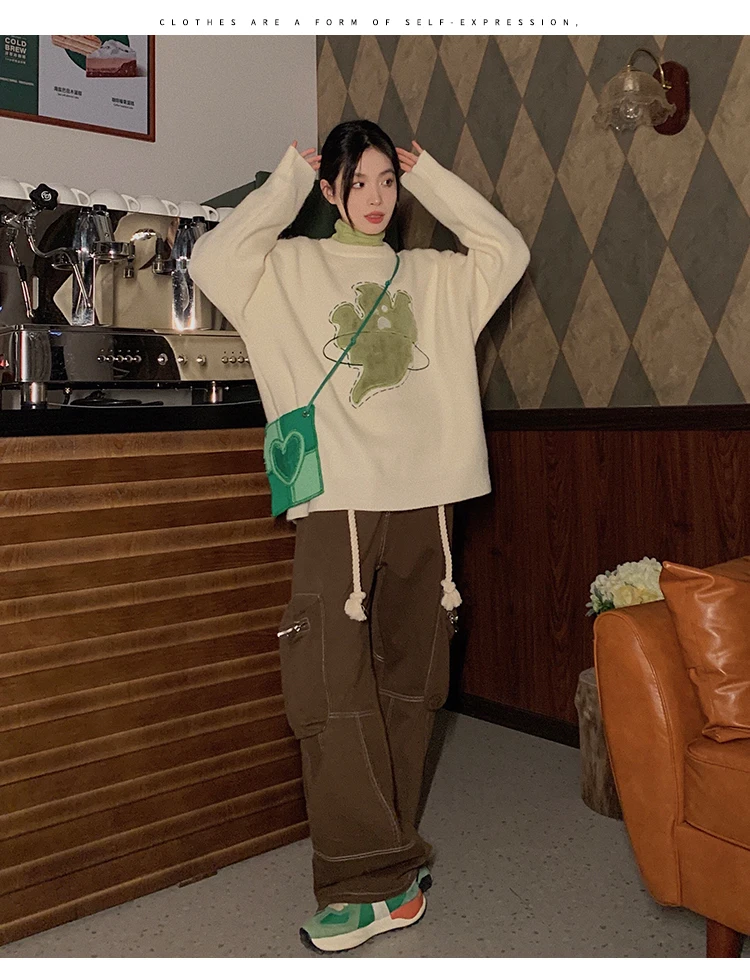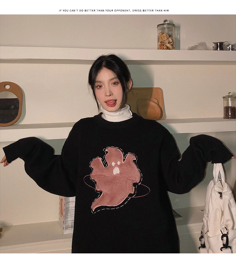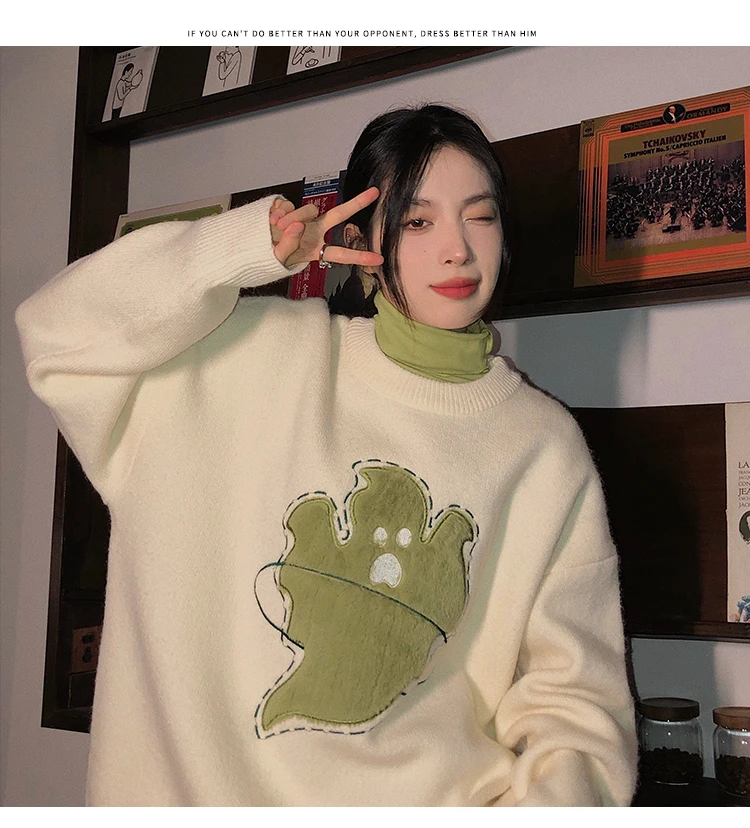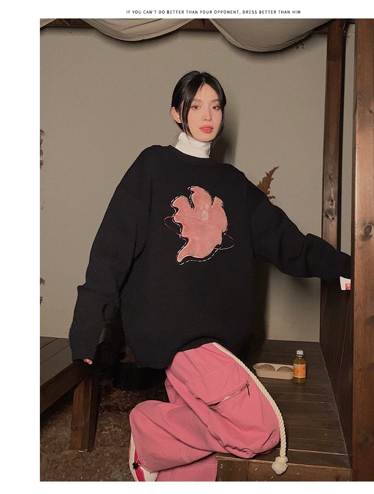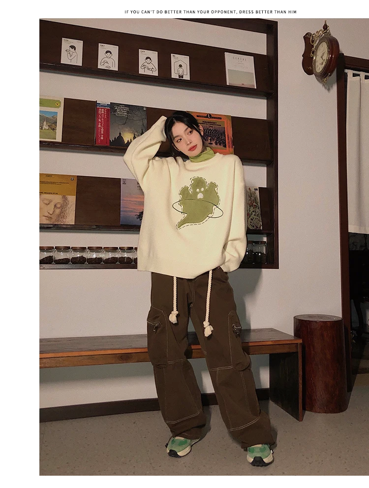 Vintage Women Apricot Sweater Round Neck Embroidery Fashion Leisure Lazy Wind Loose Winter Female Thicken Warm Knitting Pullover