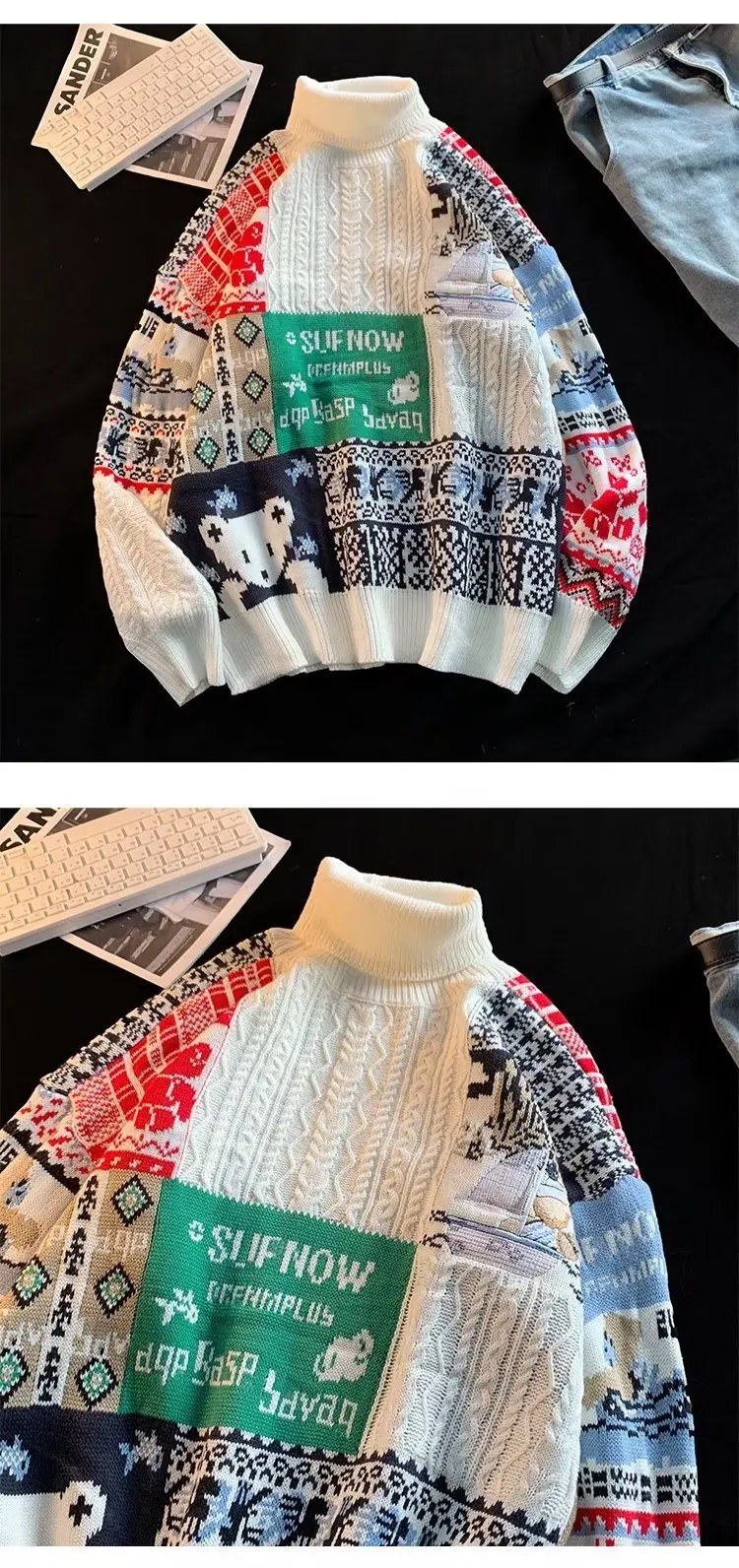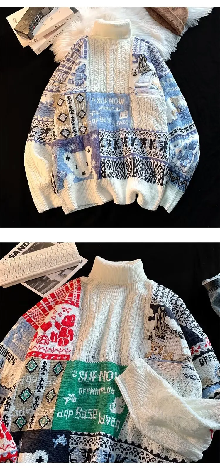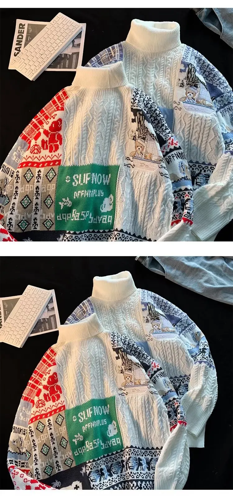 ZAZOMDE Bear Knitted Turtleneck Sweater Men 2022 Winter Jumper Harajuku Cartoon Fashion Vintage Oversize Pullover Streetwear Men